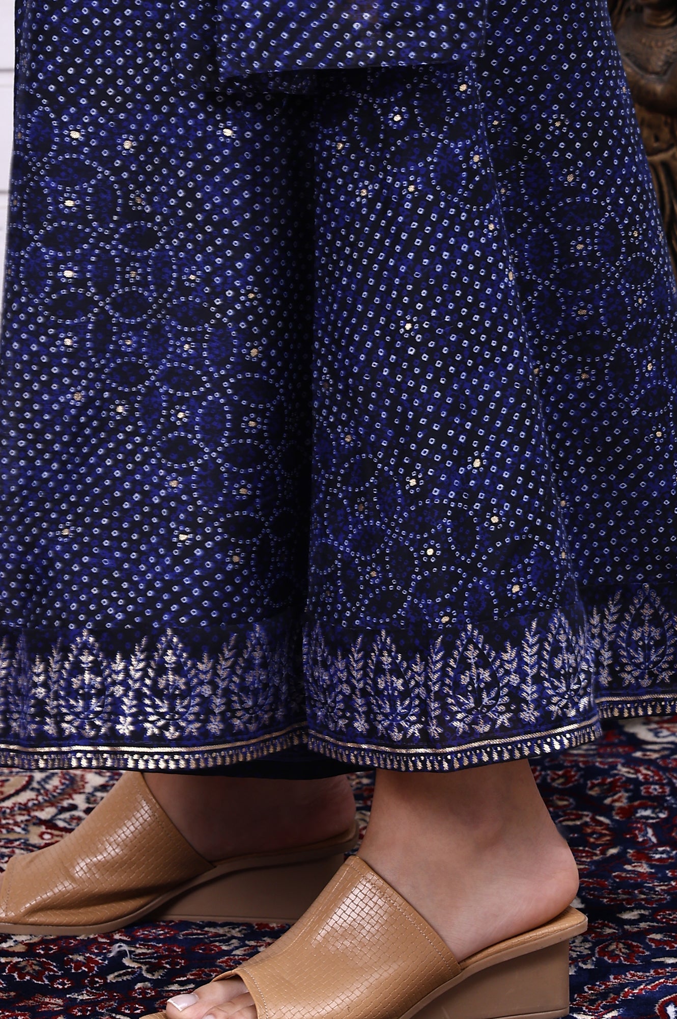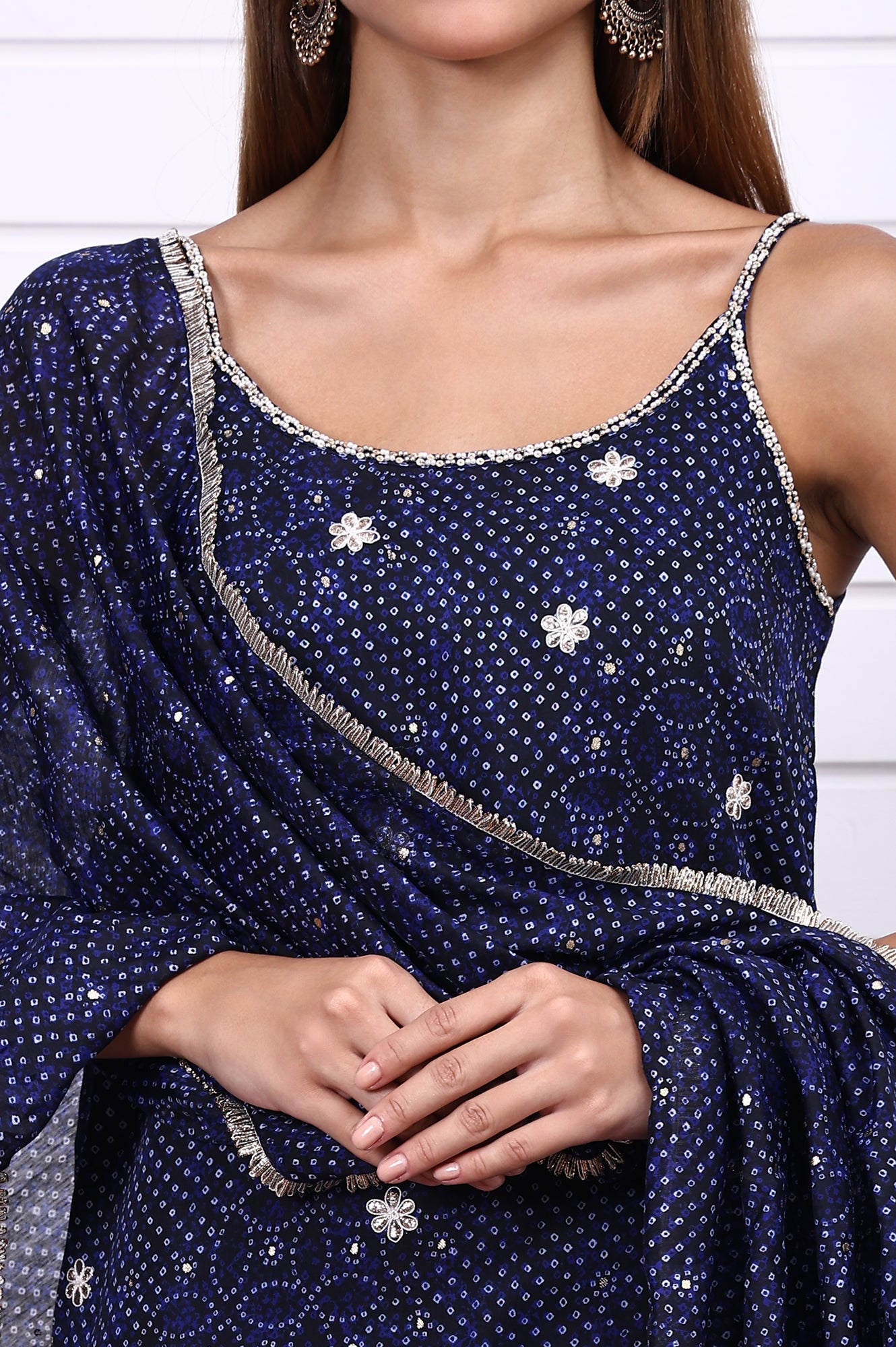 Elevate festive dressing with this blue Bandhni printed georgette ensemble featuring a spaghetti-strap straight kurta. The straight silhouette offers a modern touch to the traditional print, while delicate embroidery along the neckline and yoke brings in handcrafted elegance. The lightweight sharara adds dramatic flair with every step, and the coordinating dupatta finishes the outfit with balance and grace. Its vibrant blue base makes it perfect for Mehendi functions, haldi celebrations, or wedding dinners. The georgette fabric adds fluidity and airiness, making it easy to wear all day. Spaghetti straps give the outfit a youthful and contemporary spin, suitable for warmer occasions and destination festivities.