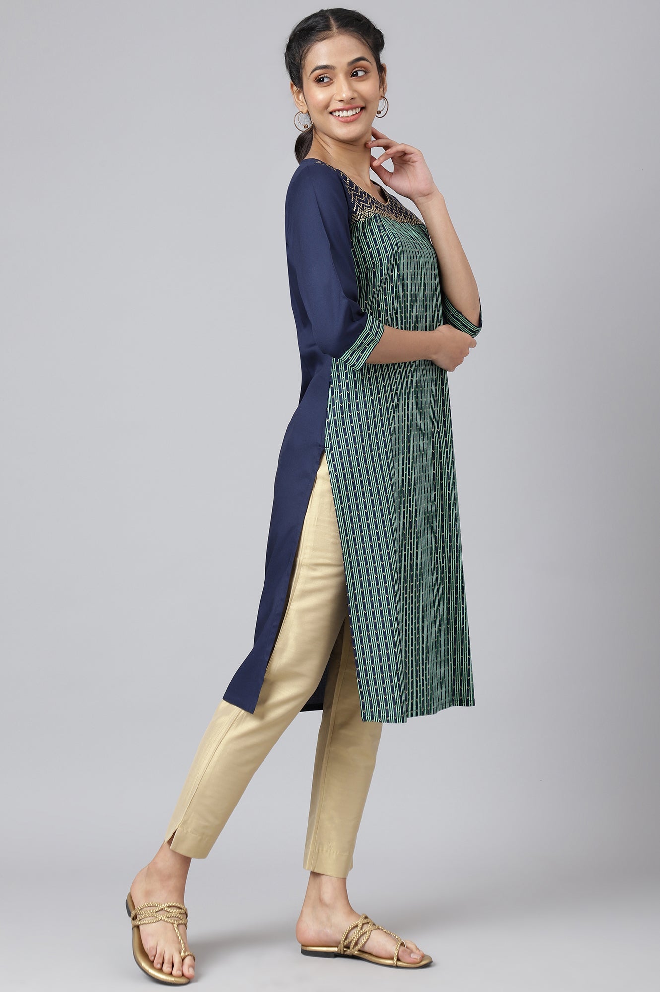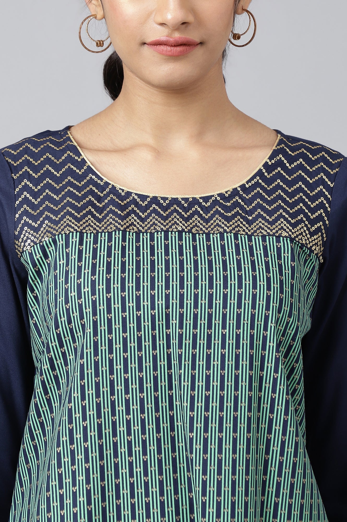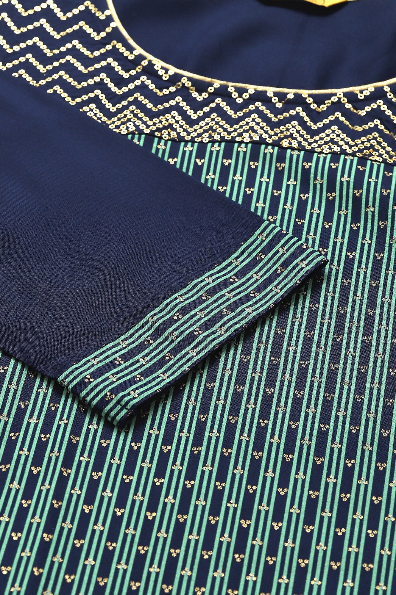 This is a color blocked kurta that features coloured stripes and golden foil printed polka dot pattern. The yoke has been highlighted with glitter sequin embroidery that follows a zig-zag fashion.