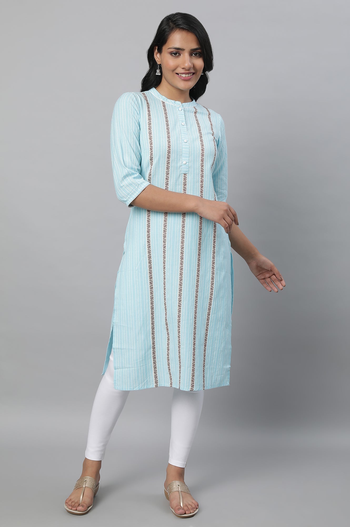 Blue cotton printed kurta in straight silhouette and band collar. The kurta is paired with white tights.