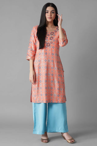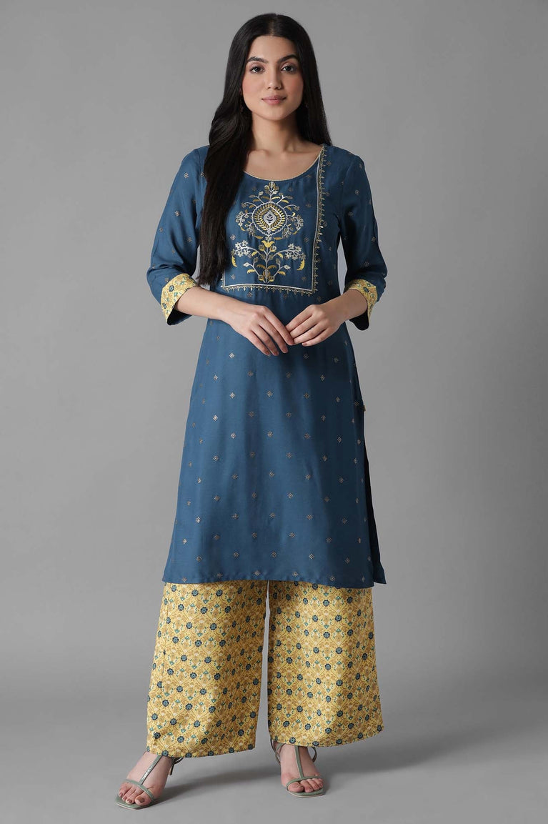 Dress up in the classic silhouettes with intricate detailing, lavish prints and rich hues to accentuate your festive look. This kurta set contains a blue glittered geometric print panelled kurta featuring zari embroidered yoke with round neckline and three-quarter sleeves. Well-matched with ankle length solid palazzos.