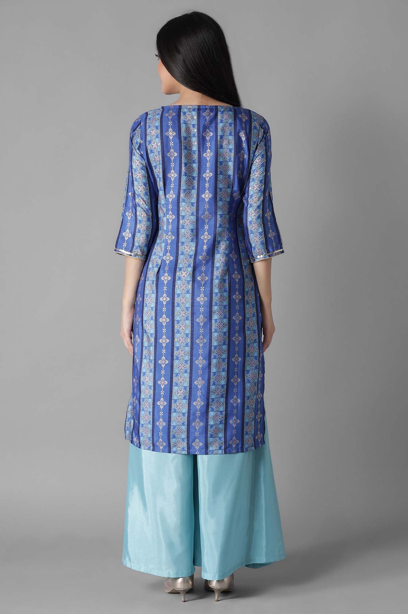 Be dressed la mode this festive season. Perfect for all occasions, this kurta set contains a blue all-over striped foil print kurta well-matched with solid palazzos.