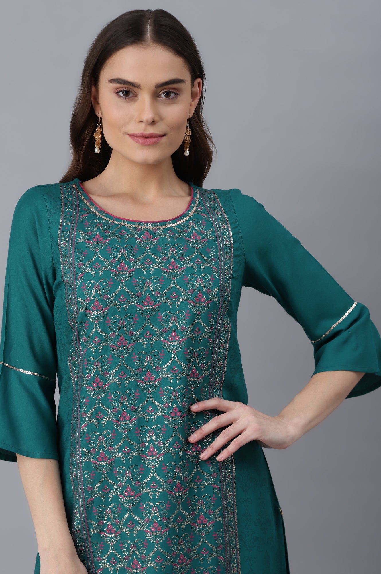 Nothing compares to a well-crafted fashion-forward silhouette. And this pair fall under this category. The kurta has floral glitter motifs and sequins. It is paired with pink solid palazzo in mid-rise and elasticated waistband.