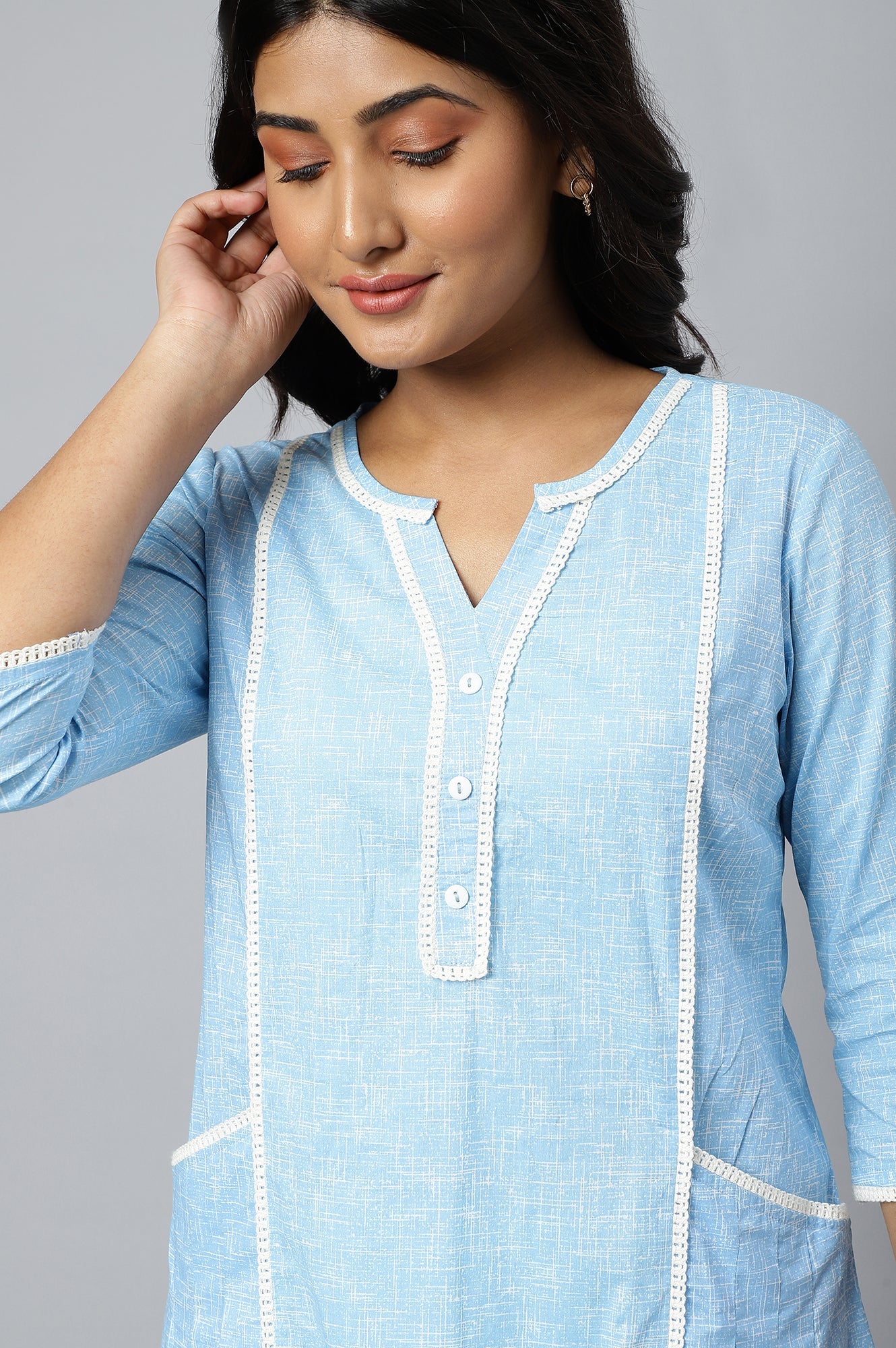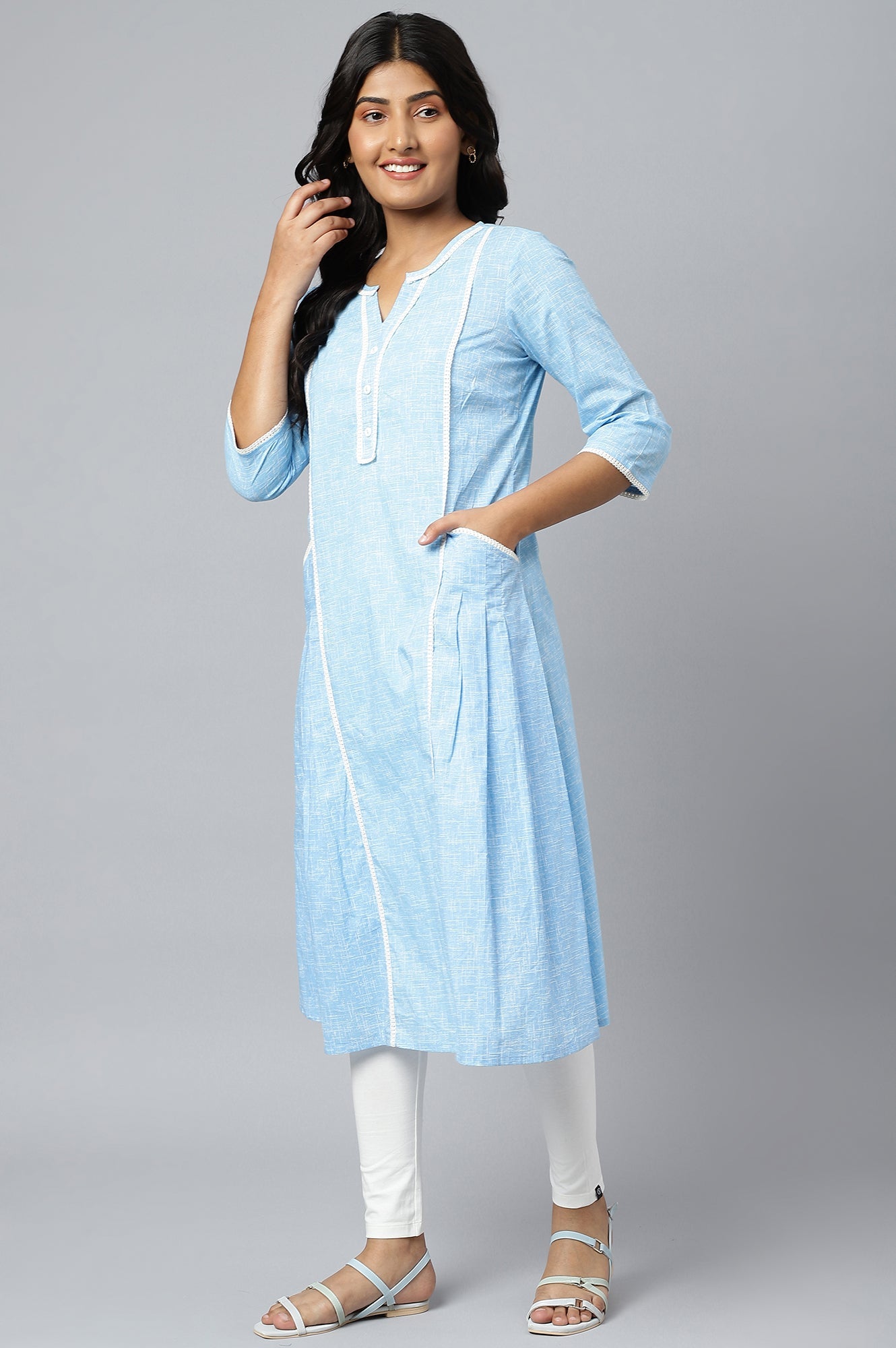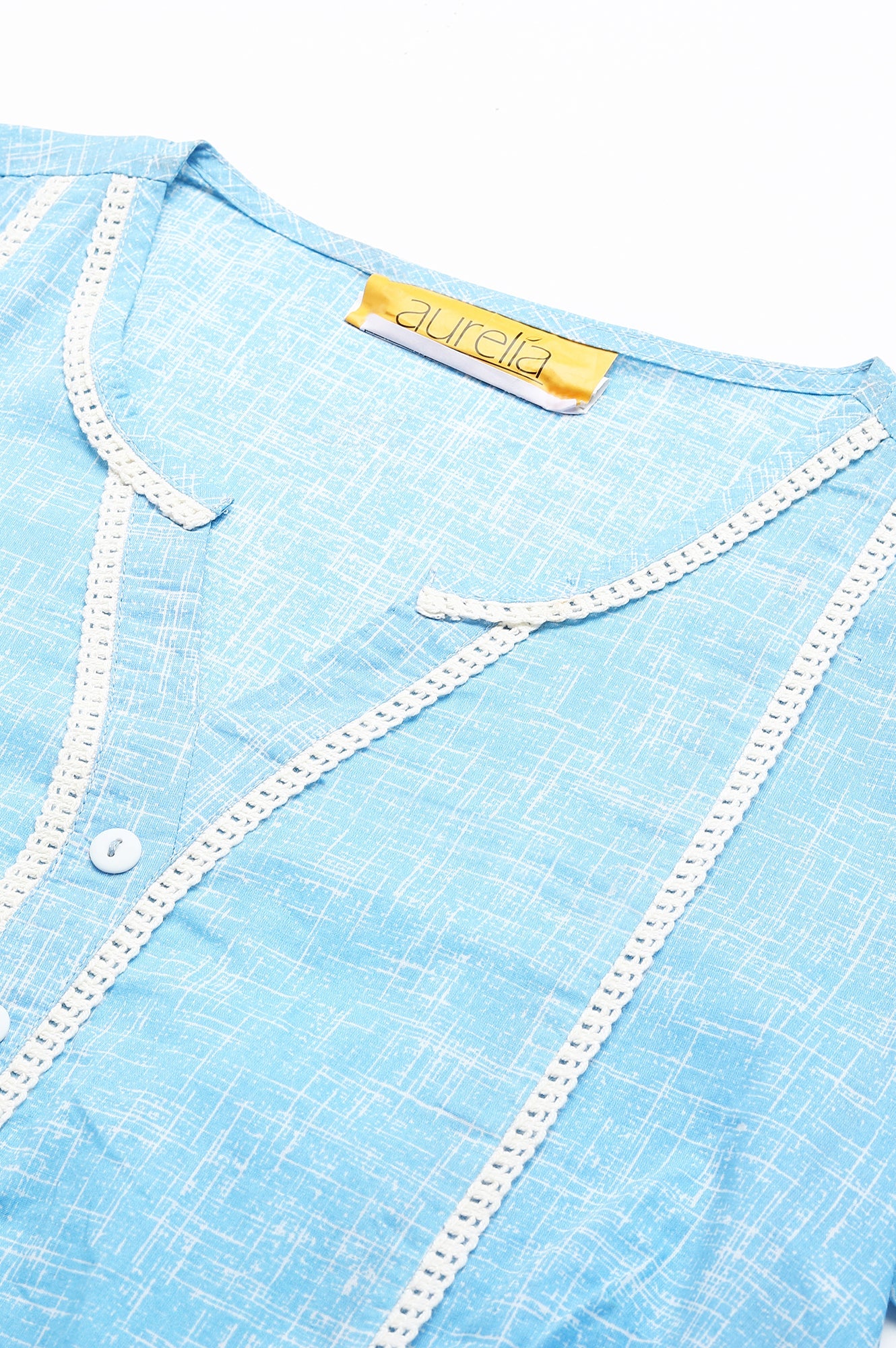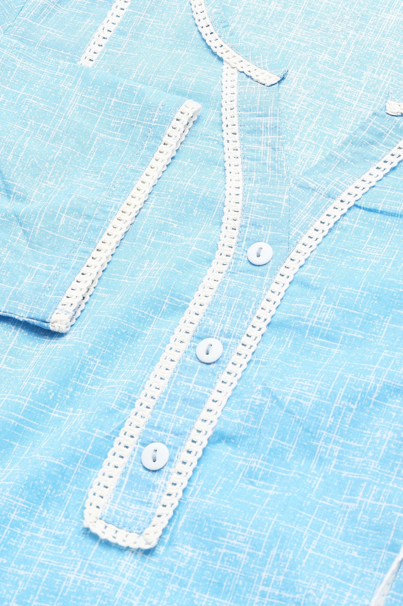 This breathable and stylish blue printed kurta is a must-have item for your wardrobe. The highlight of this style is the pleated pocket detail on both the sides, making it aesthetically functional. A delicate white lace has been used as an accent to add more appeal to the garment.