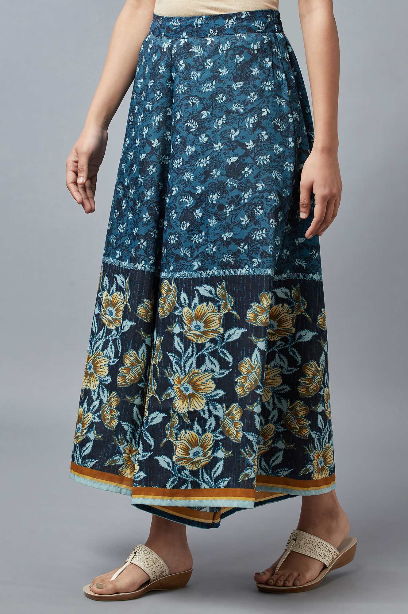 Blue coloured a-line culottes with floral print detail and a partially elasticated waistband.