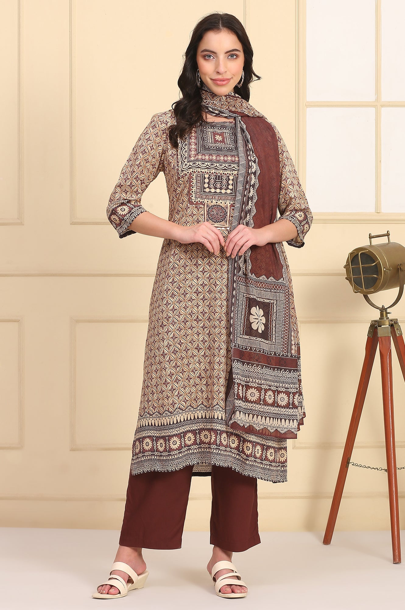 Brown Geometric Printed Sequins Straight Modal Kurta, Palazzos and Dupatta Set