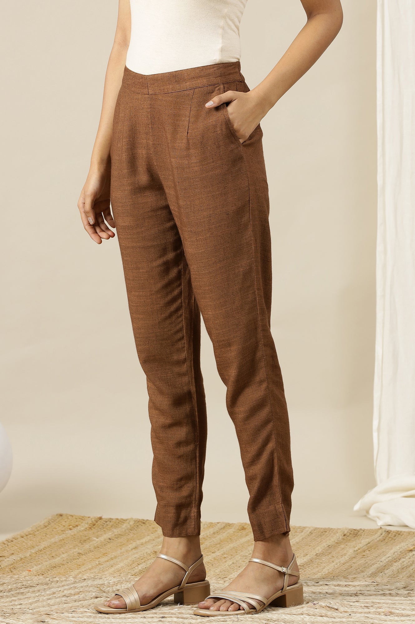 Brown Solid Rayon Flax Comfy Trousers with Pockets