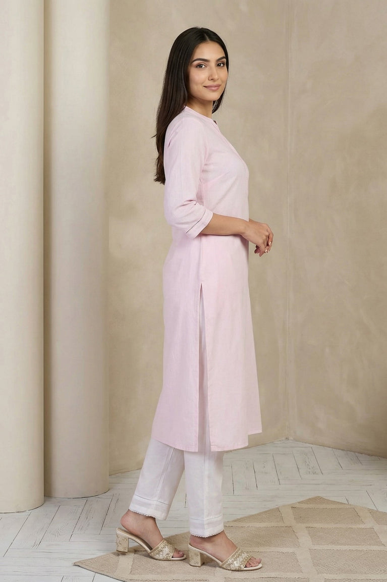Soft and sophisticated, this pink straight-cut cotton kurta is a wardrobe essential. The mandarin collar and ladder lace detailing on the neckline and sleeves add a touch of elegance, while the side slits ensure ease of movement. Perfect for casual outings or relaxed gatherings, this kurta offers a timeless and versatile style.