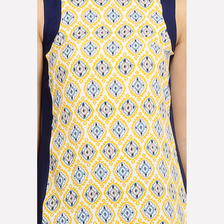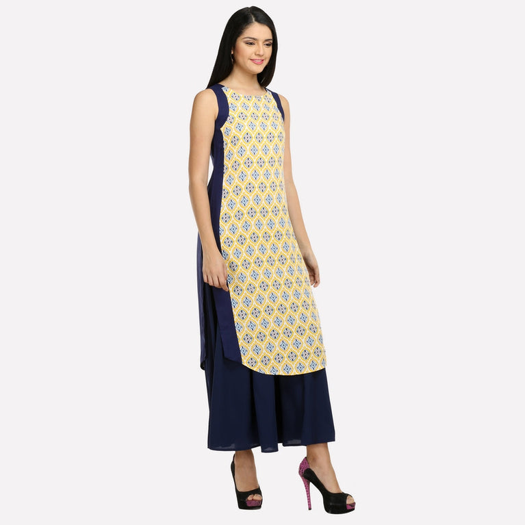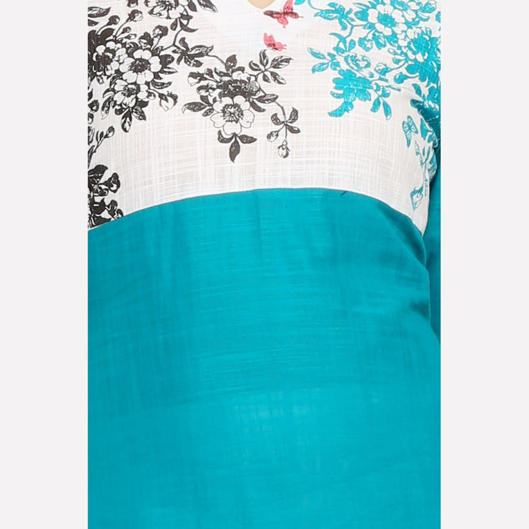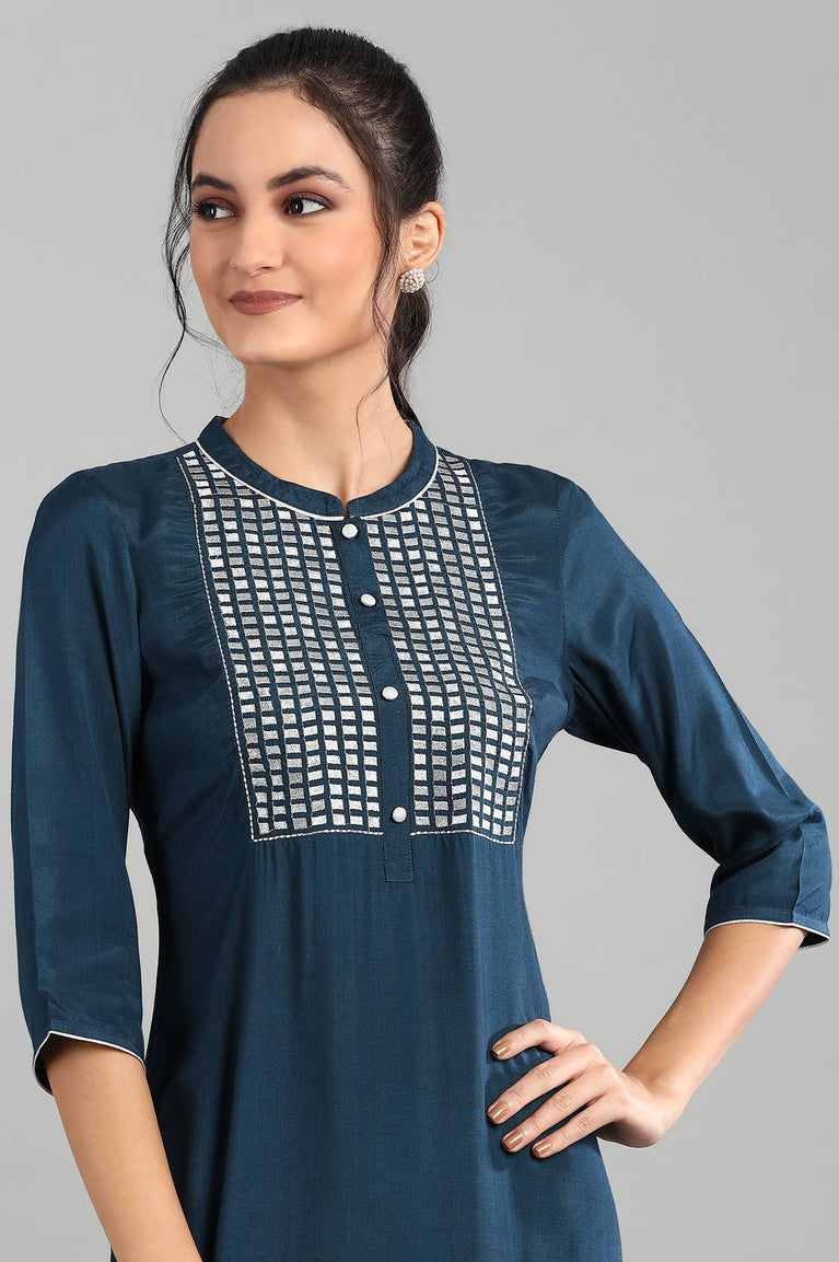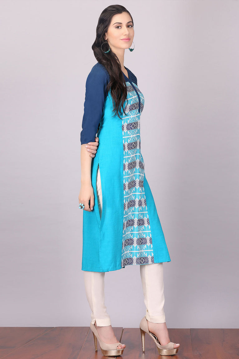 This blue mandarin neck 3/4 sleeve kurta has button placket on the front, printed detail and side slits.