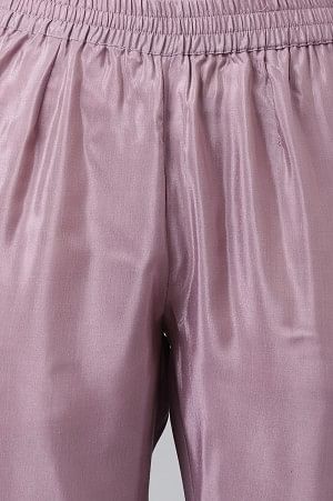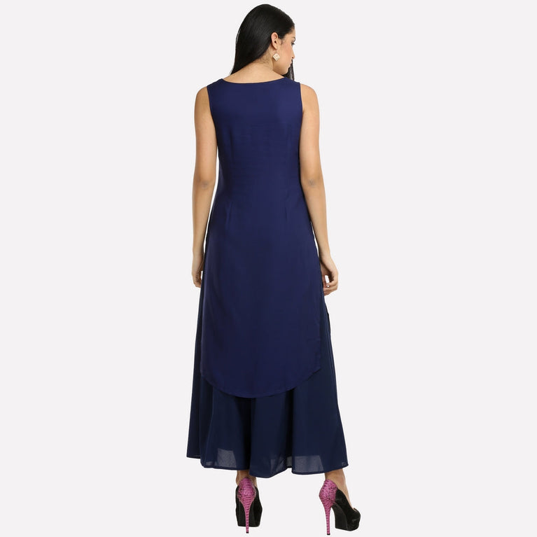 A very new trendy blue and lilac colour combination kurta set. With sequin sheeted fabric and glitter print fabric, this style flows as you move. With elbow sleeves and contrast trouser and drape, this style is very chic and has a festive appeal.