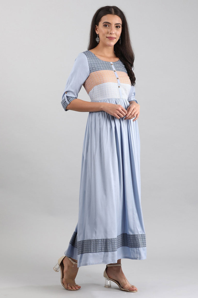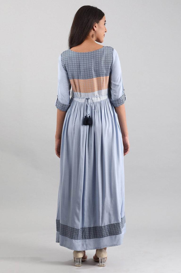 Blue round neck A-line kurta with asymmetrical hemline and printed detail.