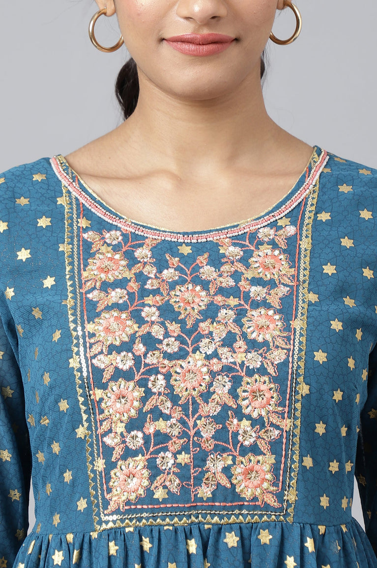 Blue coloured straight kurta having ornamental foil print, sequin embellishment, round neck type, three-quarter sleeves and side slits.
