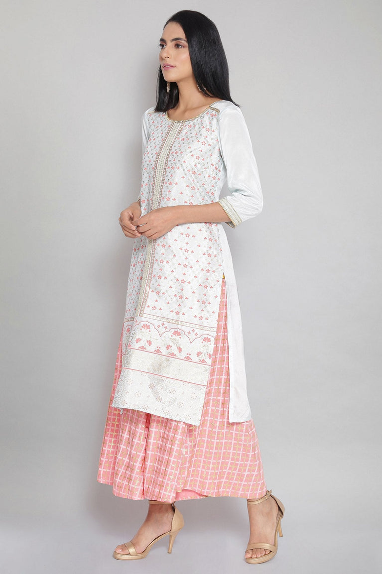 Alia's absolute favourite for a light festive event, this light blue kurta laced up with mughal foil print and sequin detailing. It features round neck and three-quarter sleeves embellished with sequin highlighting.