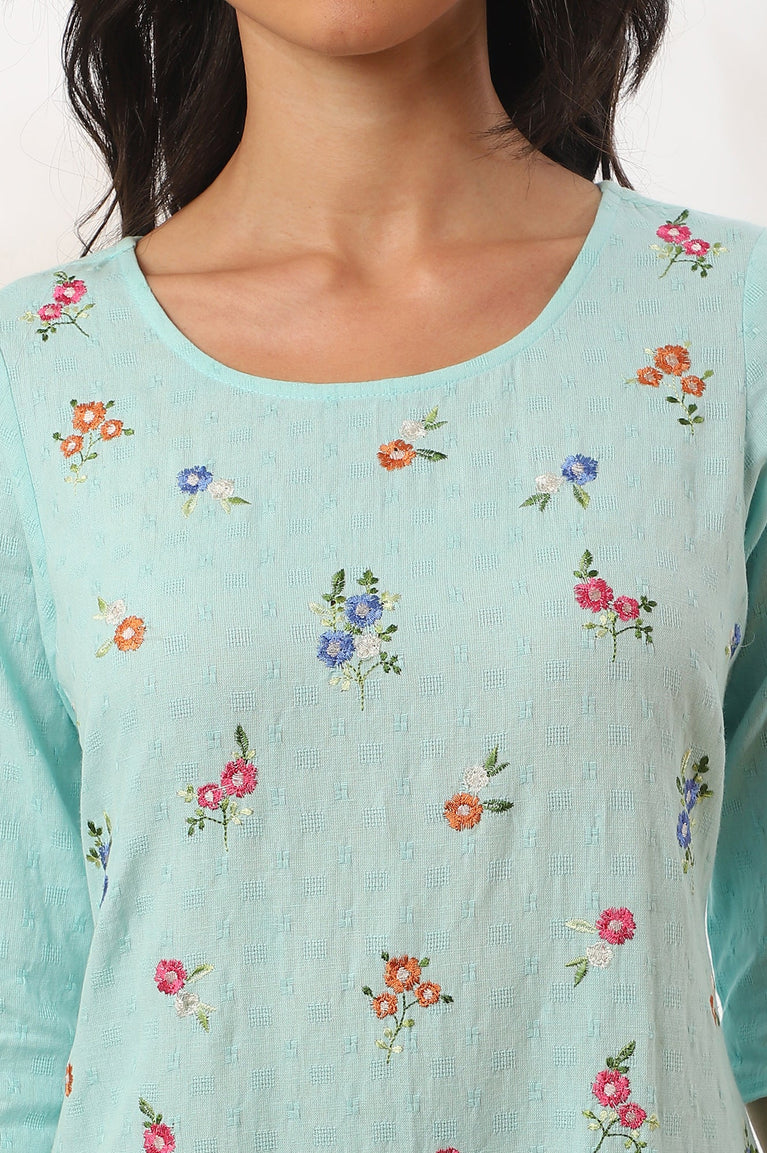 Feel Astounding In This Airy Blue Yarn Dyed kurta Accentuated With A Contast Lace Running All Around The Collar, Yoke And Sleeve Cuffs. This Is Sure To Make You Feel Top Notch.
