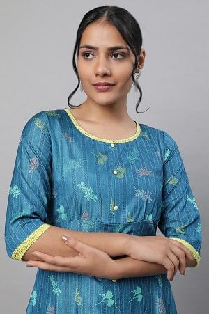 Blue coloured dress in floral motifs. This rounded hem dress has mandarin collar and three-quarter sleeves.