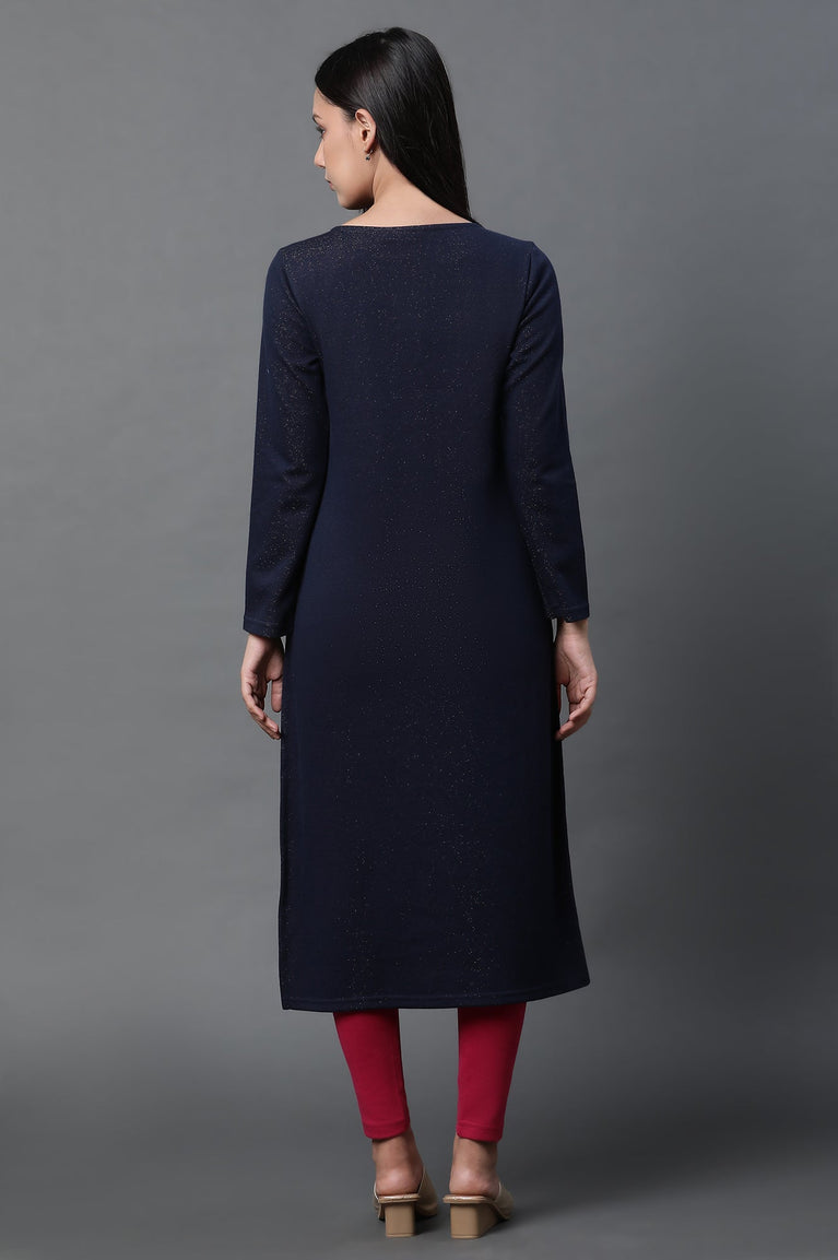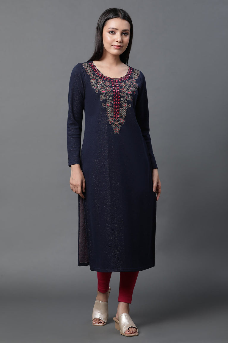 Blue Solid Embroidered Thread Work Straight Velvet Kurta with Trouser