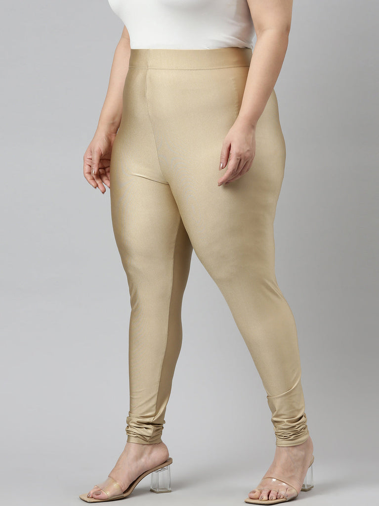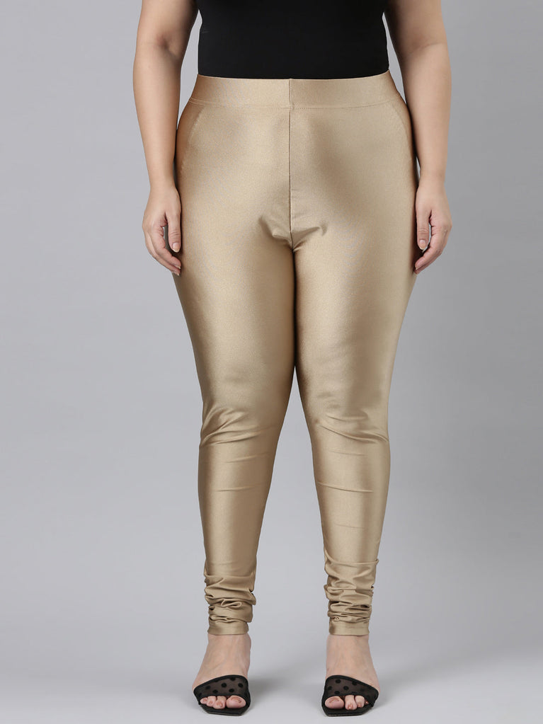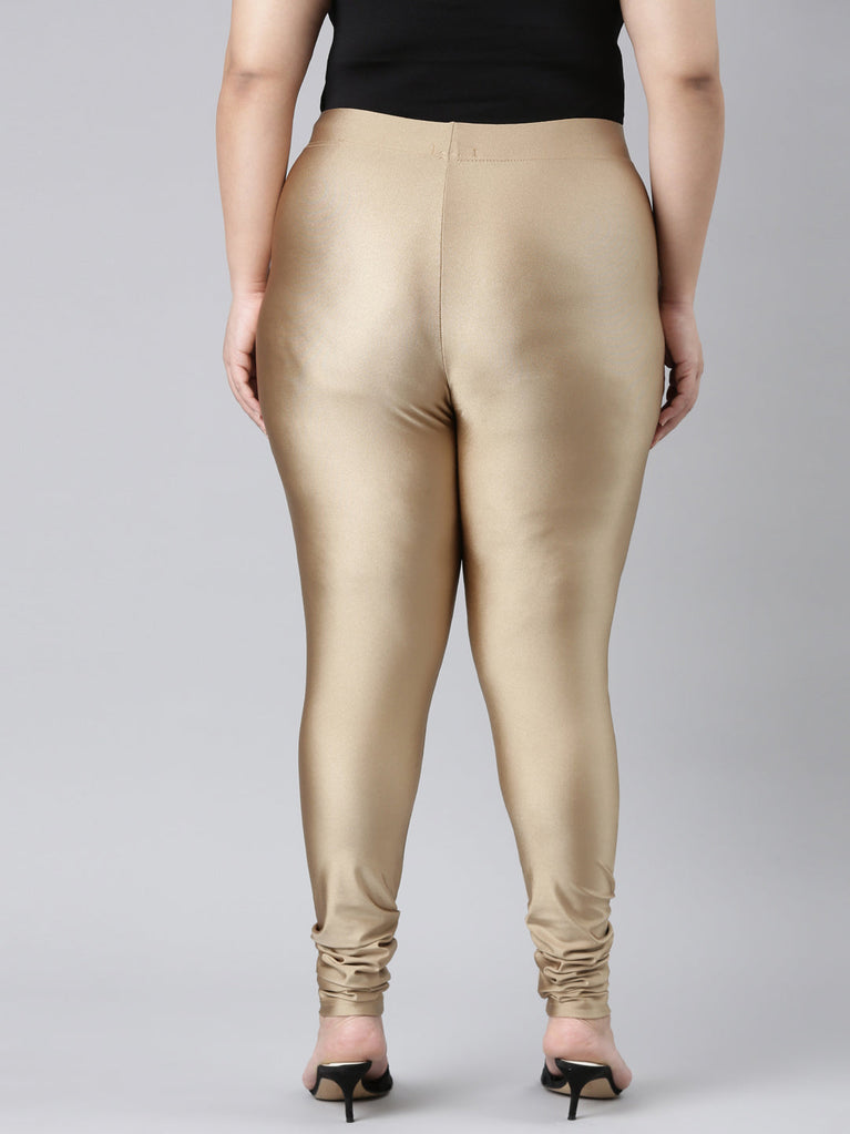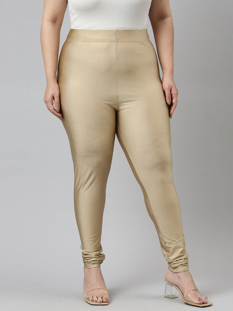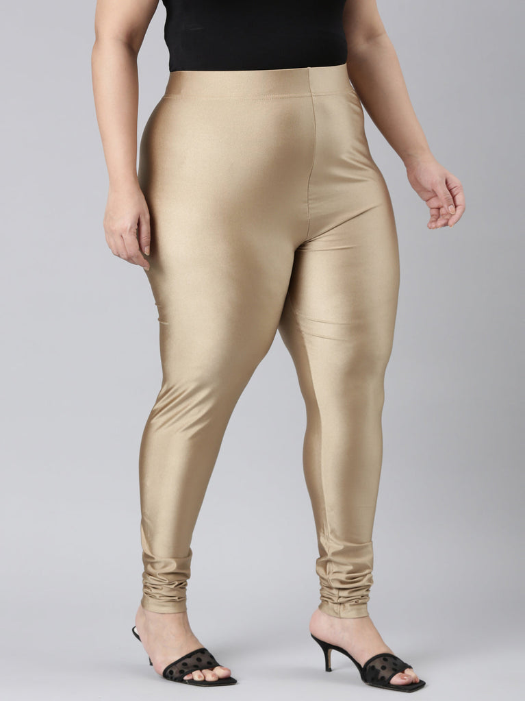 Go chic with a pair of Deep Gold Solid Shimmer Churidar Leggings. Made from high quality Nylon & Elastane, it has a elasticised waistband & gathers at the hemline.