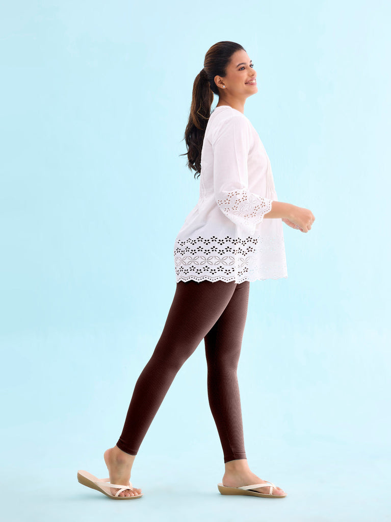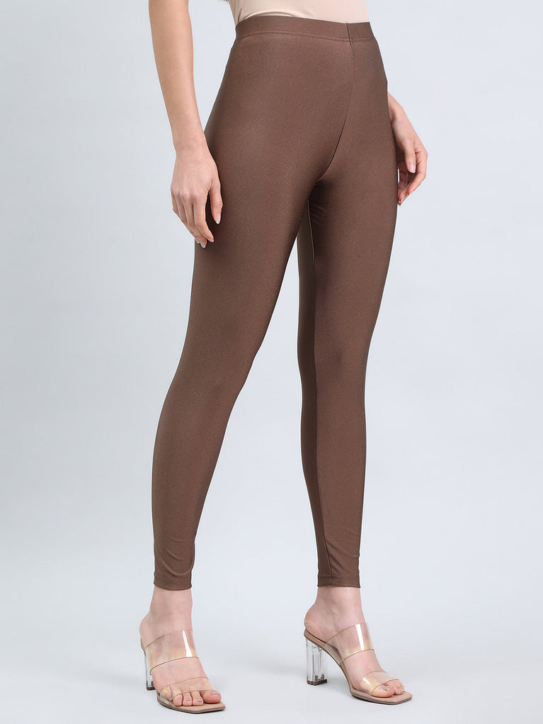 Stay comfortable yet stand out in any traditional look with Solid Brown Shimmer Leggings. Made from nylon & elastane, it has a elasticised waistband & is of slim fit & ankle length