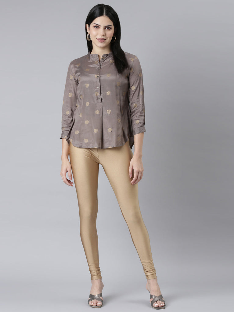 Stay comfortable yet stand out in any traditional look with Solid Dark Cream Shimmer Leggings. Made from nylon & elastane, it has a elasticised waistband & is of slim fit & ankle length.