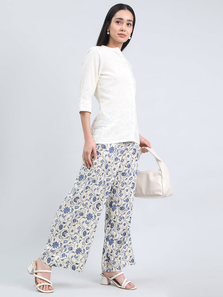 Crafted from breathable cotton, our Beige Hakoba Palazzo offers a relaxed fit with a mid-rise waist featuring adjustable inner drawstrings and ankle-length cut. Detailed with Schiffli embroidery at the hem and a side pocket, it blends everyday comfort with effortless ethnic elegance.