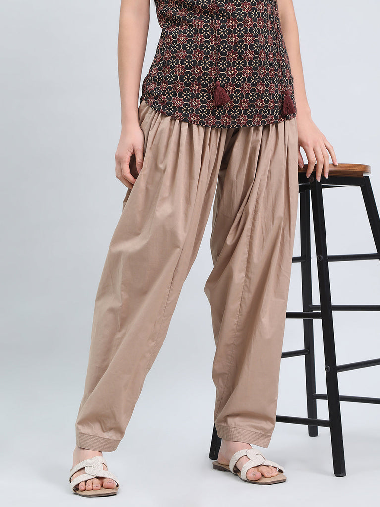 Spruce up a look or spend the day comfortably in the Beige Cotton Salwar. It has a drawstring pull-up closure, front pleats with a regular fit. Can pair it with a tunic or any kurti for a fun everyday look