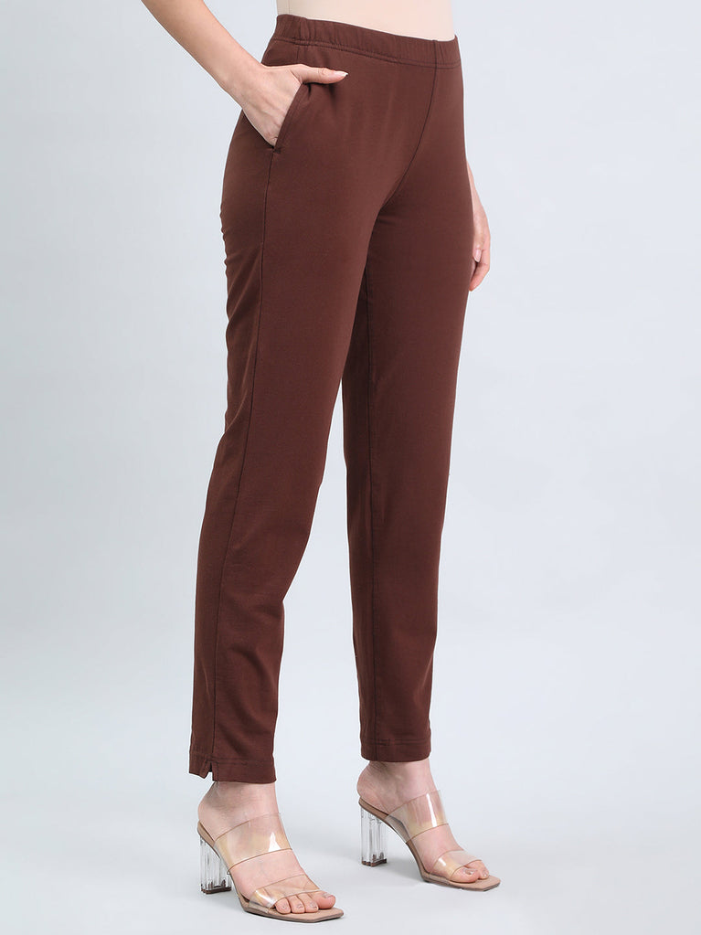 Amp up your style game for ethnic or western with our Solid Dark Brown Kurti Pants. Made from cotton & elastane, it is a mid-rise elasticised waistband pant with slant pocket & a tapered fit