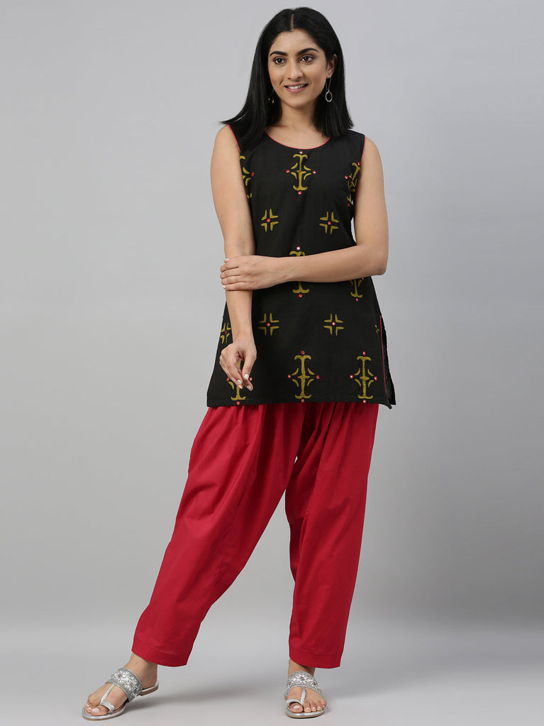 Spruce up a look or spend the day comfortably in the Black Cotton Salwar. It has a drawstring pull-up closure, front pleats with a regular fit. Can pair it with a tunic or any kurti for a fun everyday look.