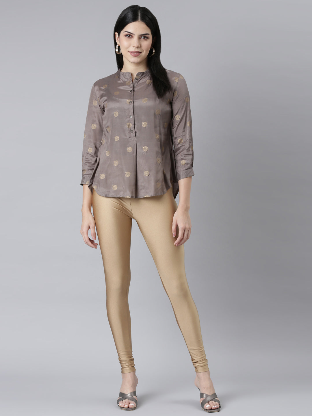 Go chic with a pair of Deep Gold Solid Shimmer Churidar Leggings. Made from high quality Nylon & Elastane, it has a elasticised waistband & gathers at the hemline.