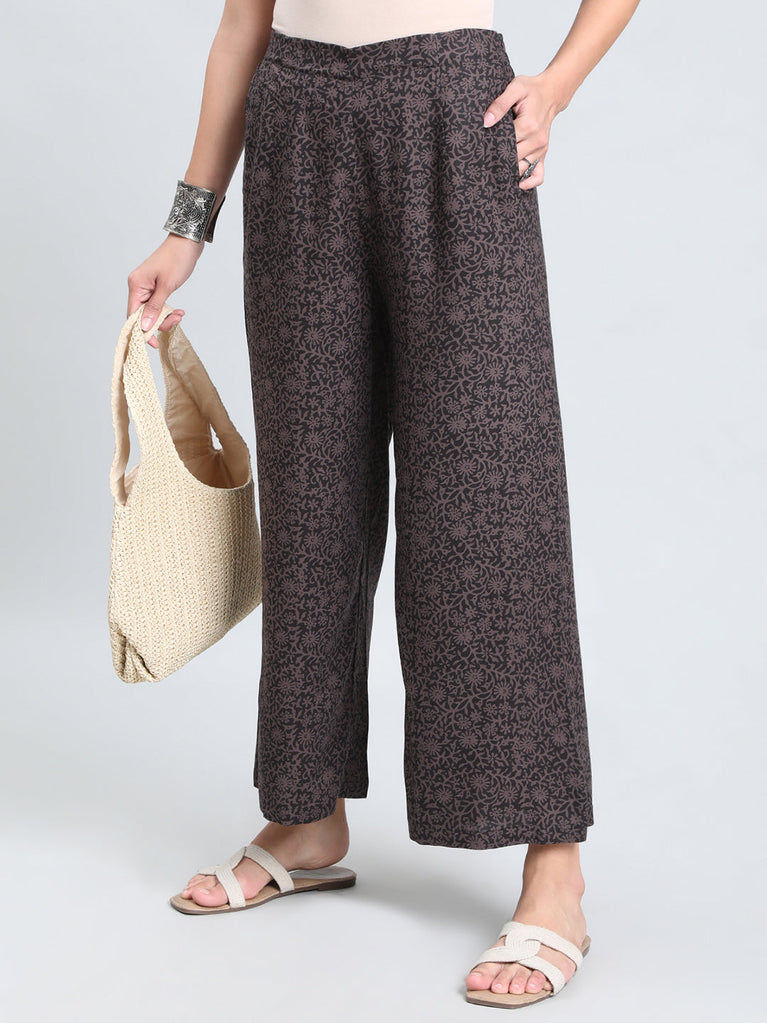 Go from meetings to a club in a jiffy in a pair of Brown Mid Rise Printed Palazzos paired with a button up shirt. Made from viscose, it is has a wide leg silhoutte & is a mid-rise palazzo with elasticised waistband & a side slant pocket