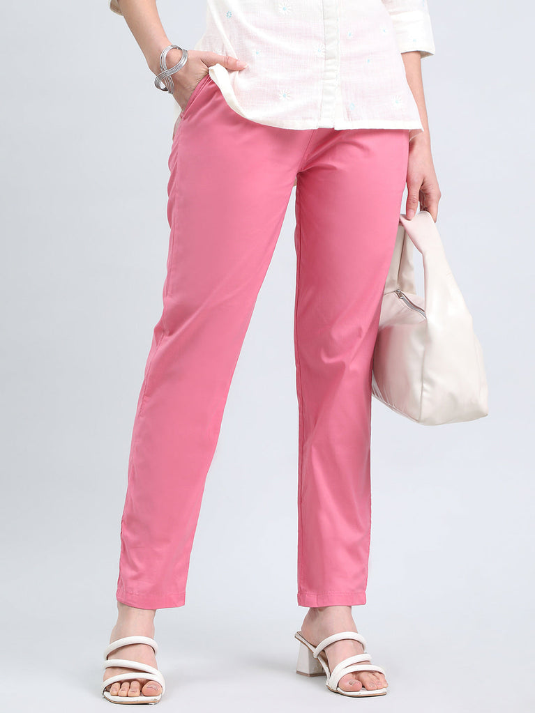 Go from casual to street smart look in a jiffy with the Solid Blush Pink Cotton Pants. Made from cotton, it has a elasticised waistband with drawstring closure, slant pockets, mid rise & a tapered fit