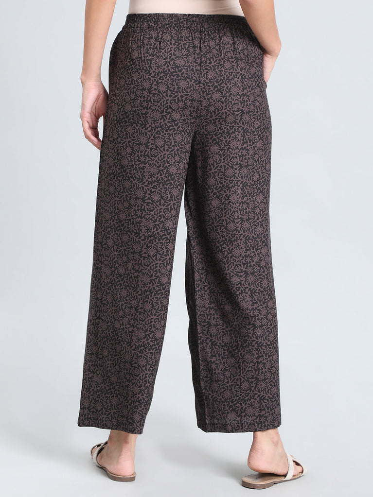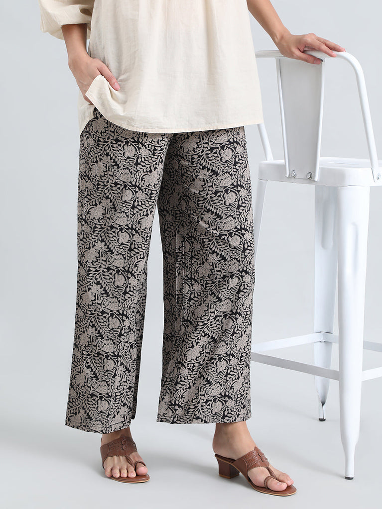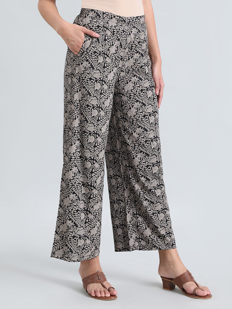 Go from meetings to a club in a jiffy in a pair of Black Mid Rise Printed Palazzos paired with a button up shirt. Made from viscose, it is has a wide leg silhoutte & is a mid-rise palazzo with elasticised waistband & a side slant pocket.