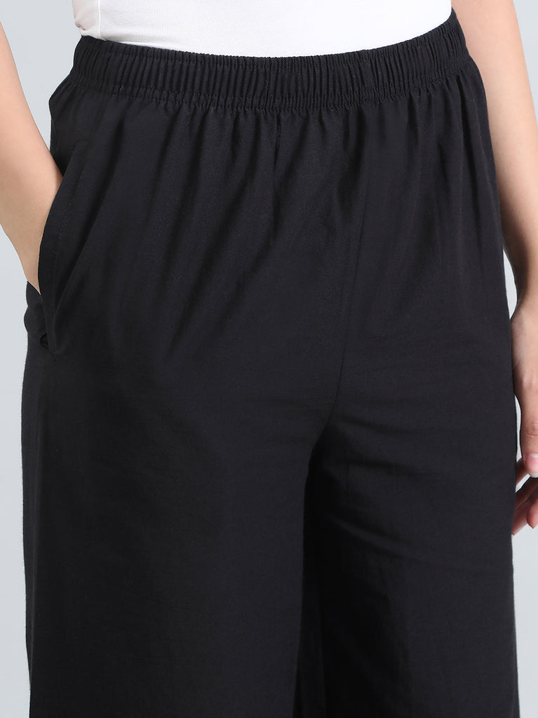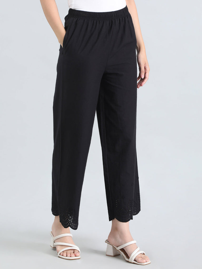 Crafted from breathable cotton, our Black Hakoba Palazzo offers a relaxed fit with a mid-rise waist featuring adjustable inner drawstrings and ankle-length cut. Detailed with Schiffli embroidery at the hem and a side pocket, it blends everyday comfort with effortless ethnic elegance.