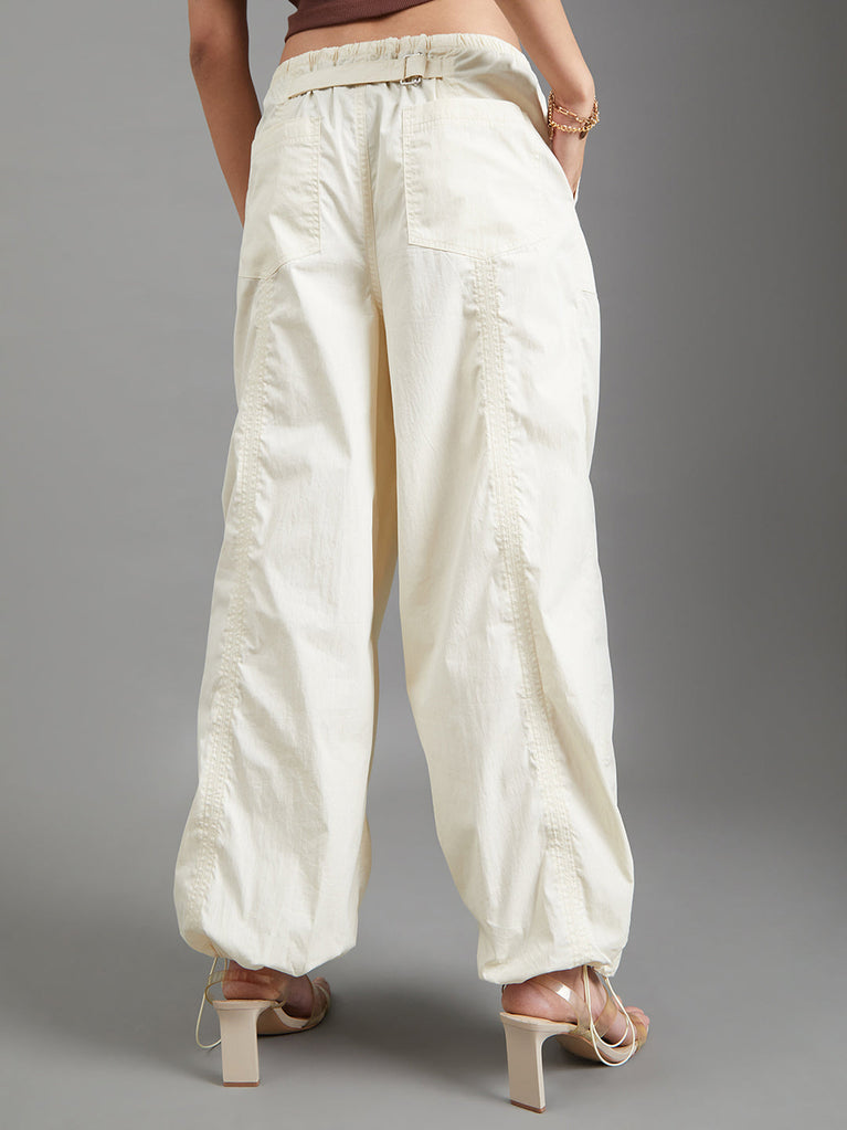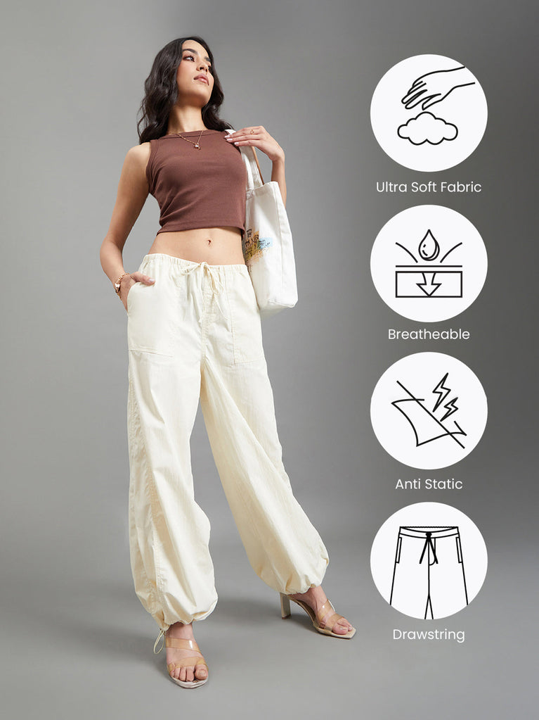 Stay cool and confident with these Cream Parachute Pants, crafted from a soft and sturdy 73% Cotton and 25% Nylon blend. Designed for a relaxed, baggy fit with full length and mid-rise waist with 4 functional pockets, they feature a convenient slip-on closure and woven construction for breathability. Ideal for free spirits and street-style aficionados looking for lightweight comfort and the latest trend in loose silhouettes.
