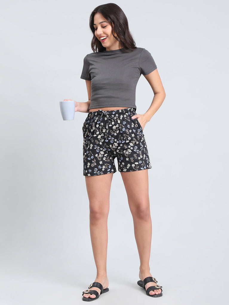 Look chic while lounging in our Black Printed Knit Lounge Shorts. Made from cotton, it has a elasticised waistband with drawstring closure, slant pockets & is extremely light weight