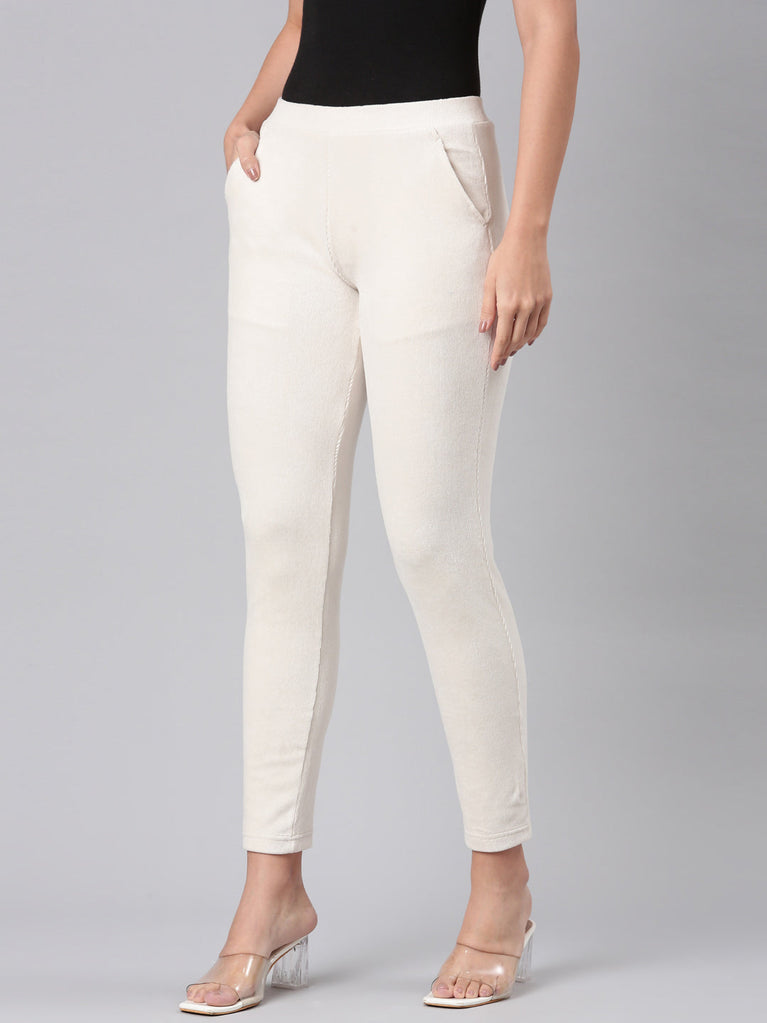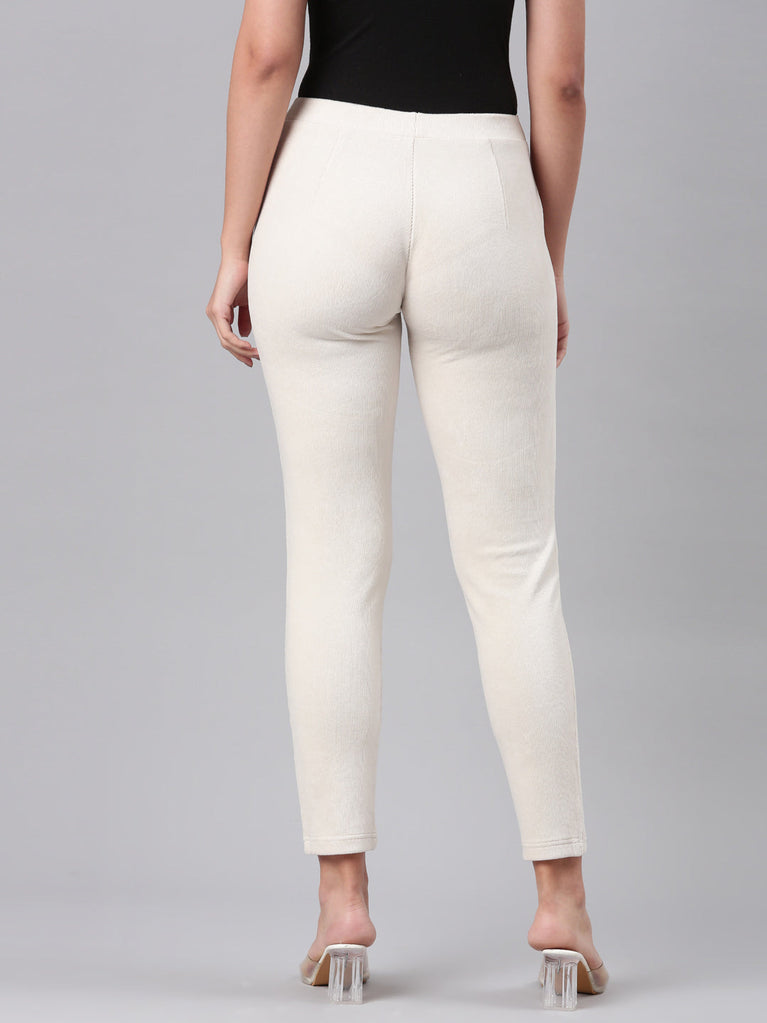 Bundle up in freezing temparatures in the Solid Cream Corduroy Treggings. Made from cotton, polyester & PU, the slip on trousers have a elasticised waistband, slant pockets & a tapered fit.