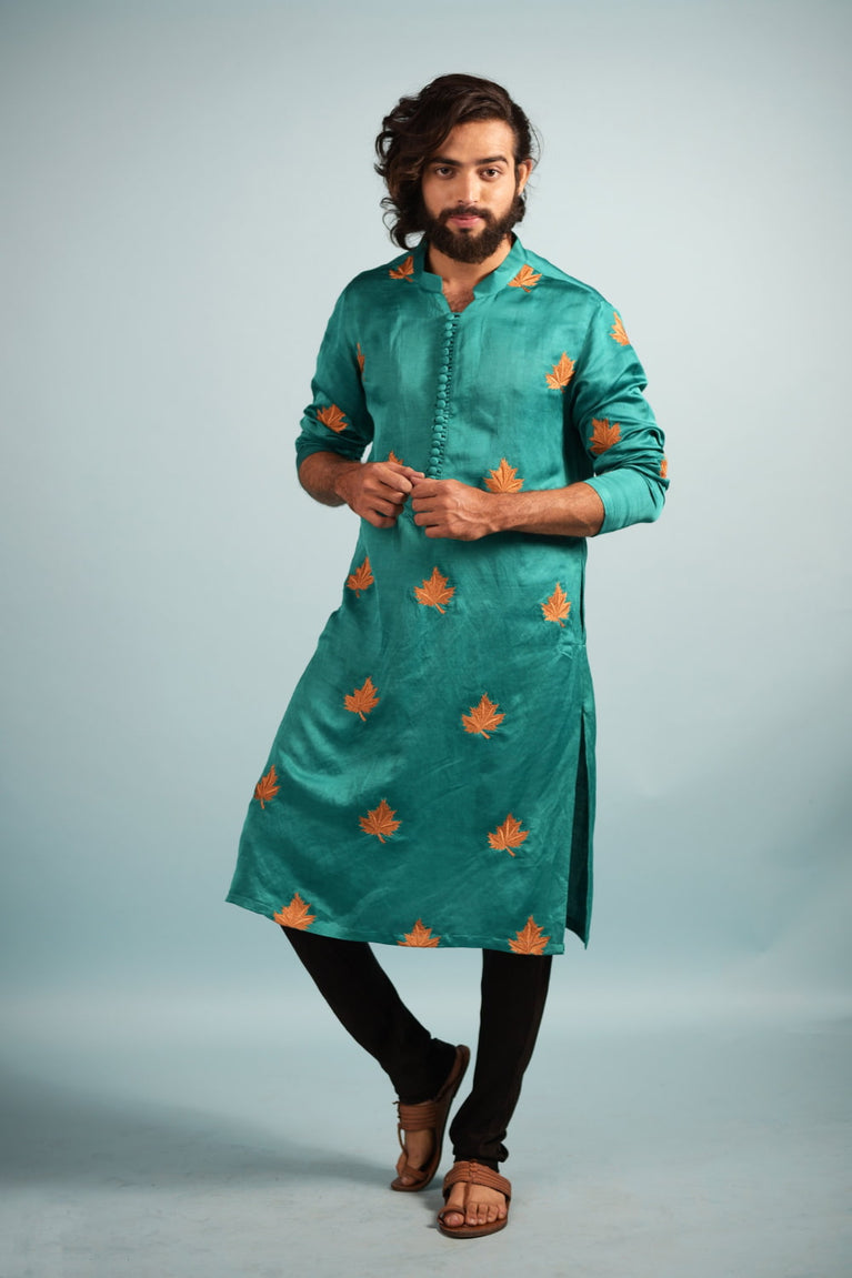 Leaf machine embroidered kurta, comes with cloth buttons and a loop to close. Pair it up with any pair of pants & you're ready to go