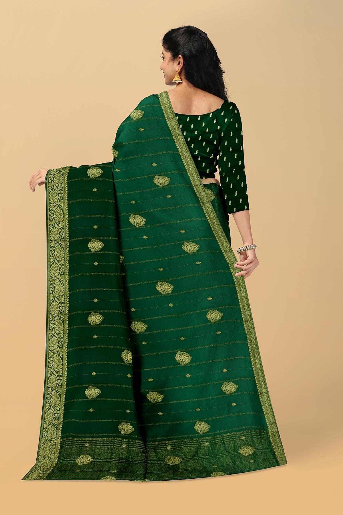 Latest DARK GREEN JAAL DUPION SILK Saree with ZARI border. This saree comes with EMBOSE SILK blouse.