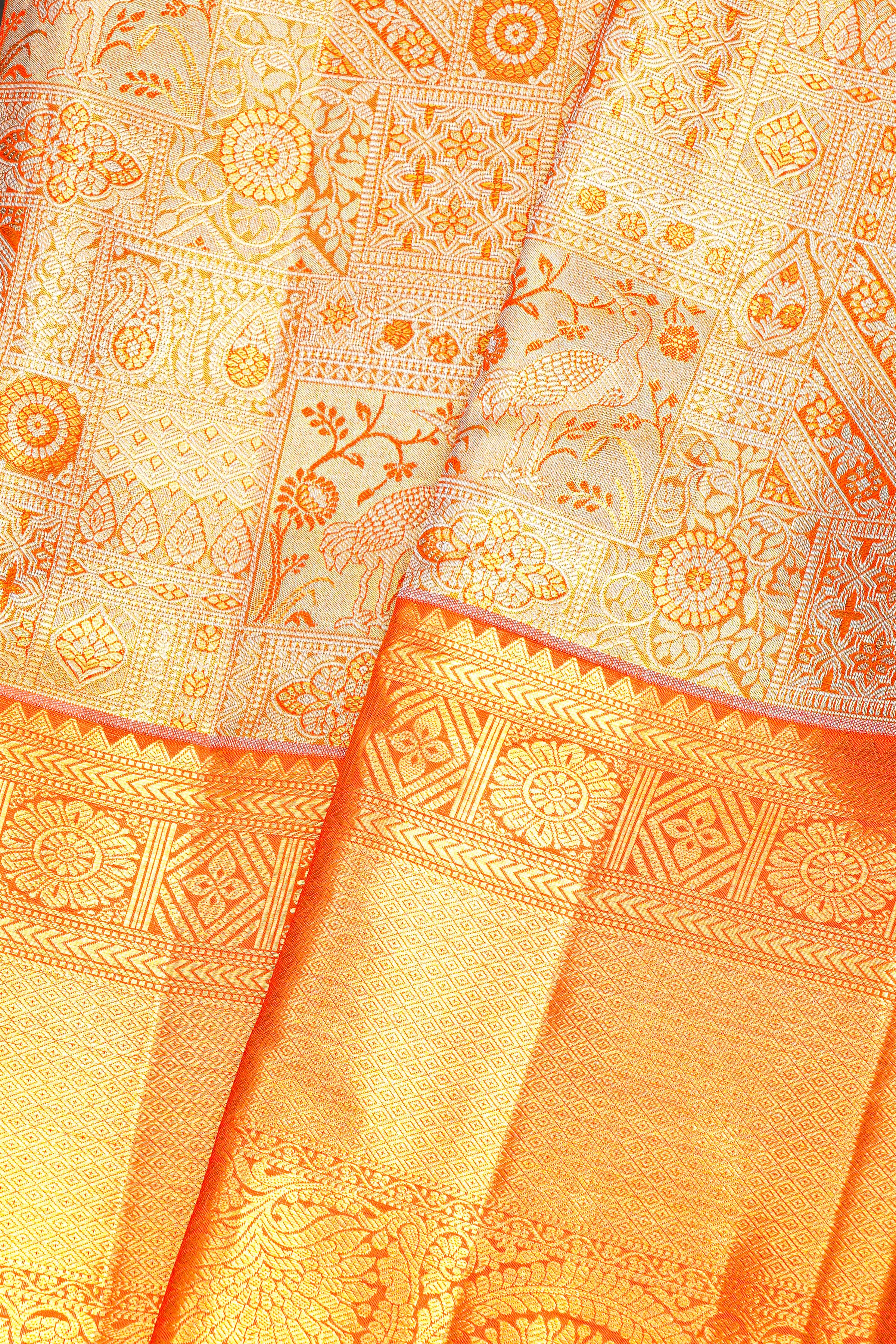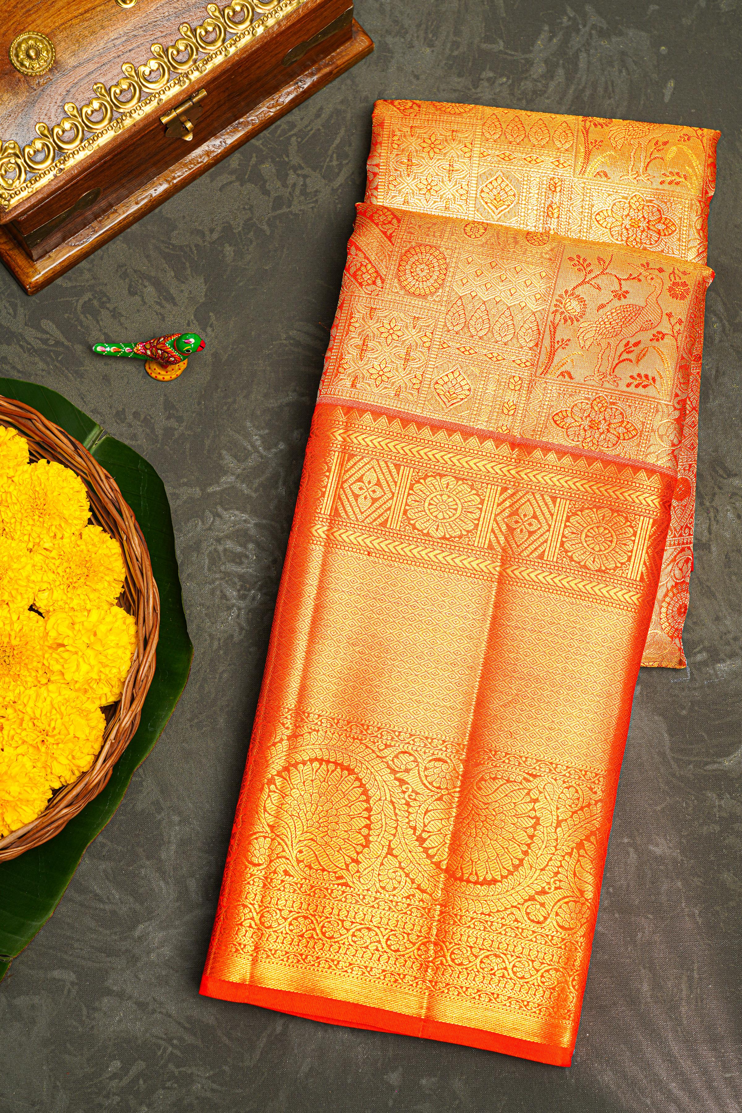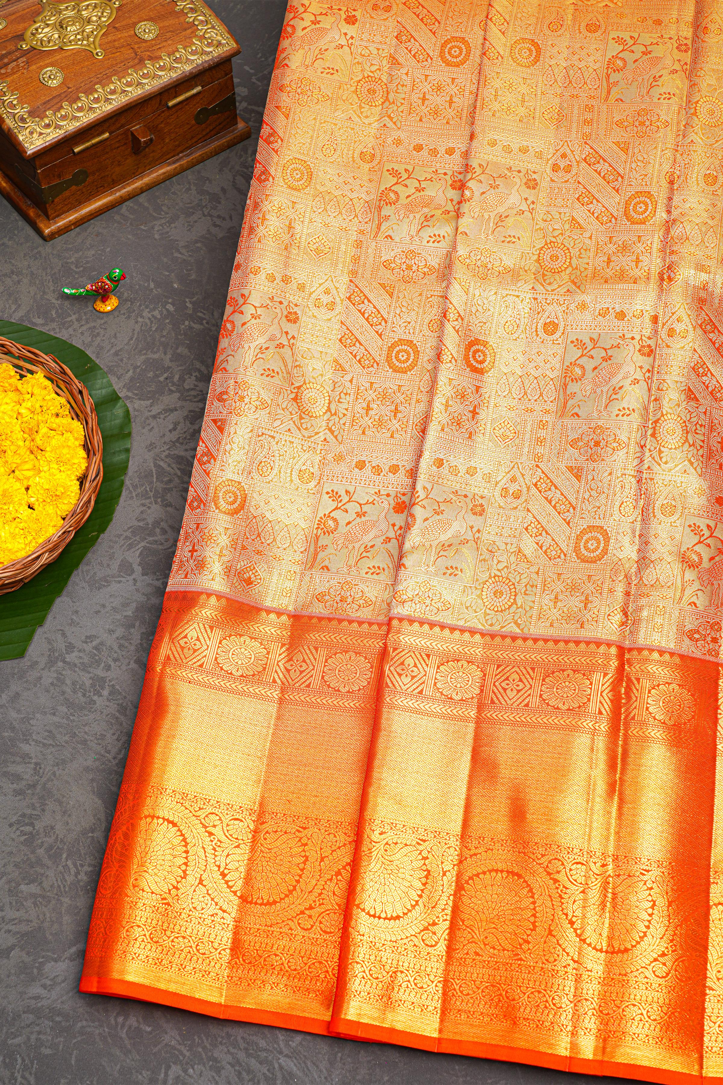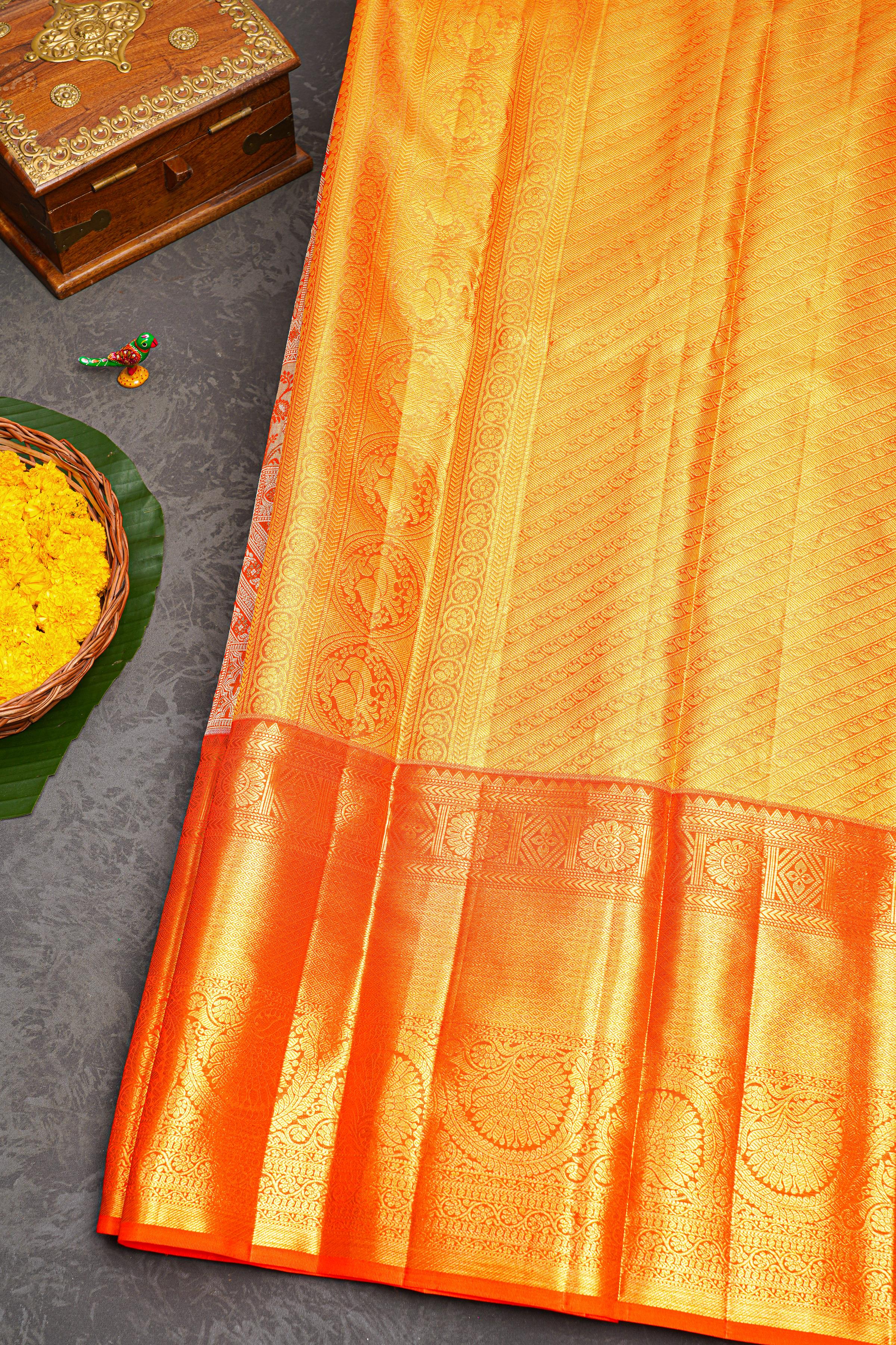 GOLD ORANGE and GOLD FLORAL JAAL SILK Saree with KANCHIPURAM