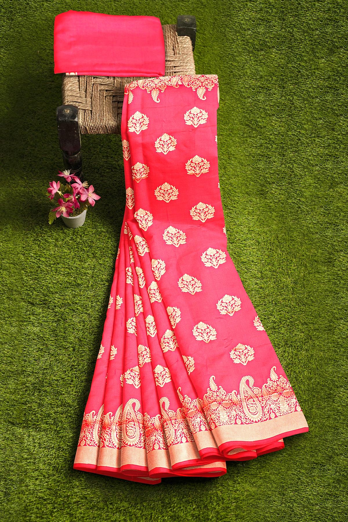 Latest PINK BUTTIS SILK BLEND Saree with SELF ZARI border. This saree comes with PLAIN WITH BORDER SILK BLEND blouse.