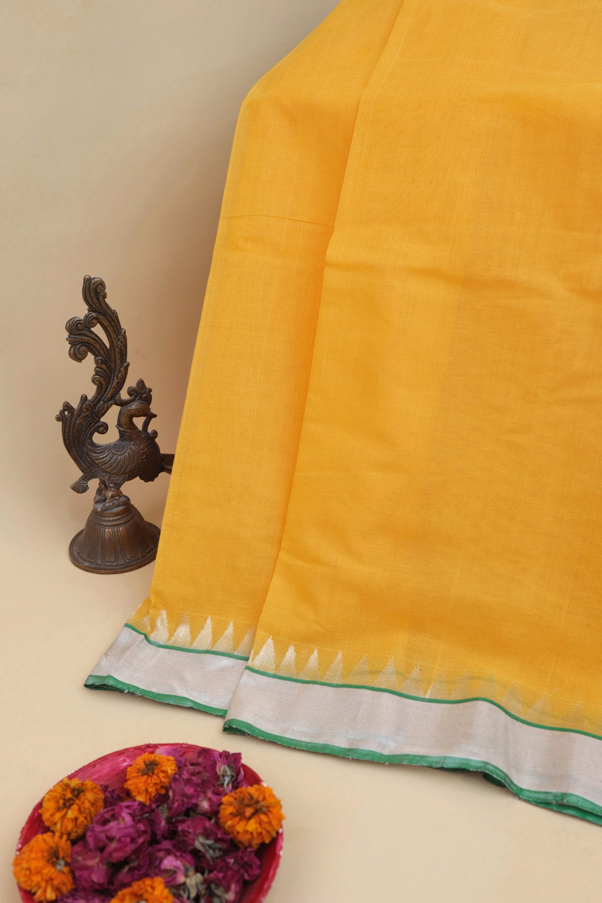 Ignite the allure of sophistication wearing our Khaadi Cotton Yellow Saree, perfect for wedding and festive celebrations, exuding sublime beauty. The plain body sets a serene foundation, complemented by the splendor of the kaddi border, adding traditional allure. Adorned with delicate florals, the pallu enhances the sublime grace of this ensemble. Paired with a self with border blouse, this saree ensures you radiate splendiferous charm on your special day.