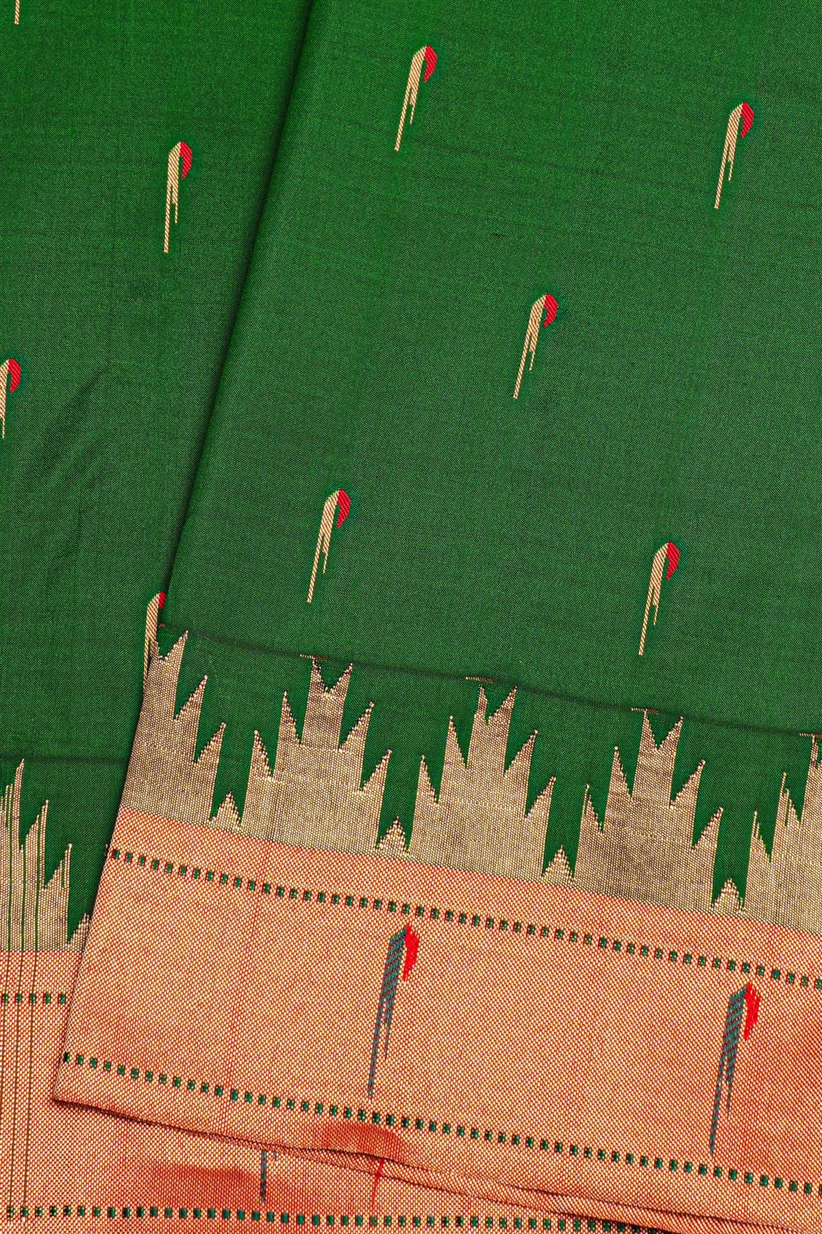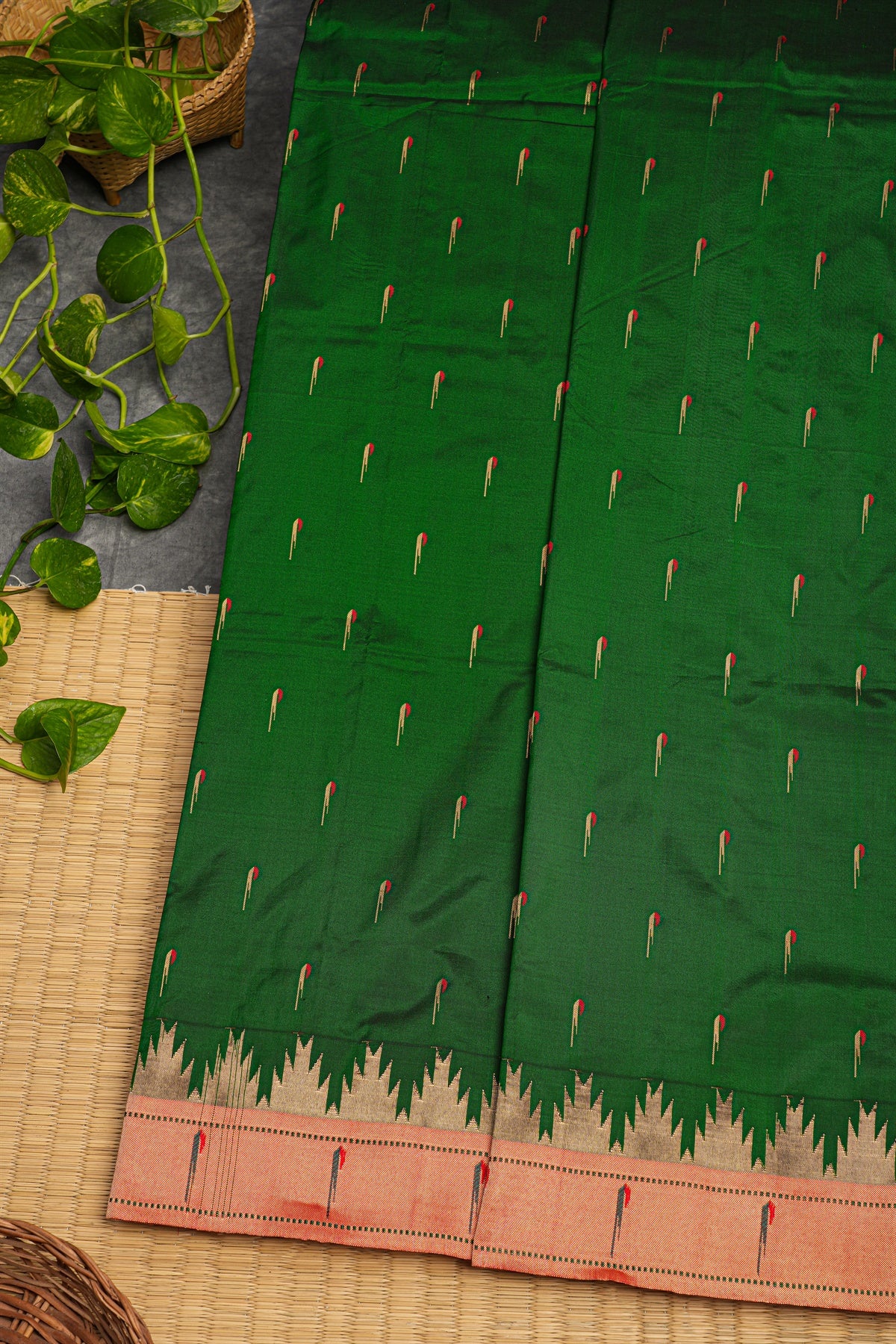 Awaken the goddess within, in our Paithani Silk Bottle Green Saree. The vibrant saree enriched with all over muniya buttis depicts visions of heavenly beauty while the contrast border intricately designed in single muniyas resonates elegance. To complete the flamboyant ensemble, the Paithani pallu and the stunning contrast with border border blouse puts together a glamorous attire for a grand evening.