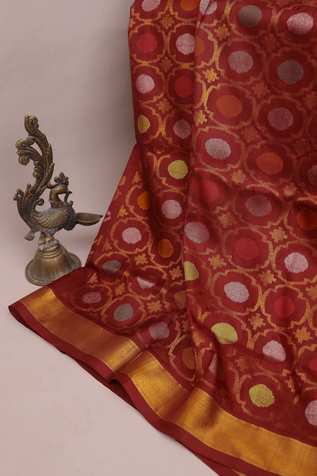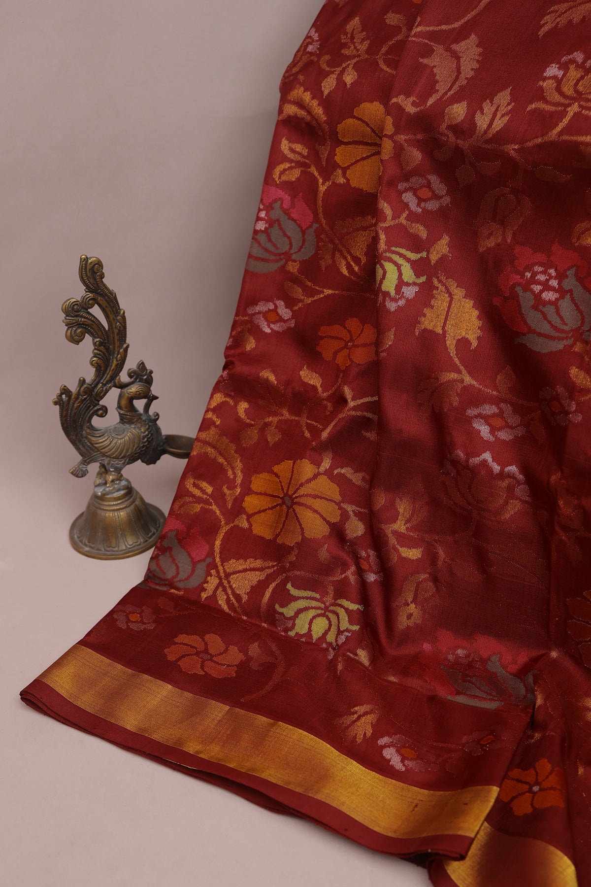 The Uppada Silk Maroon Saree weaves a tale of timeless elegance with its floral and leaves jaal, a tribute to nature's artistry. Adorned with intricate Kaddi, the border forms a graceful frame for the botanical masterpiece. A regal pallu of brocade cascades in splendor, completing the ensemble with a touch of royalty. The self-blouse, echoing the border's allure, adds a harmonious finish to this classic ode to tradition.