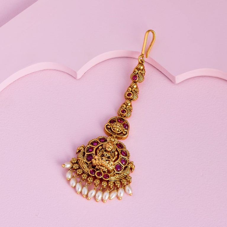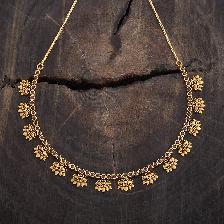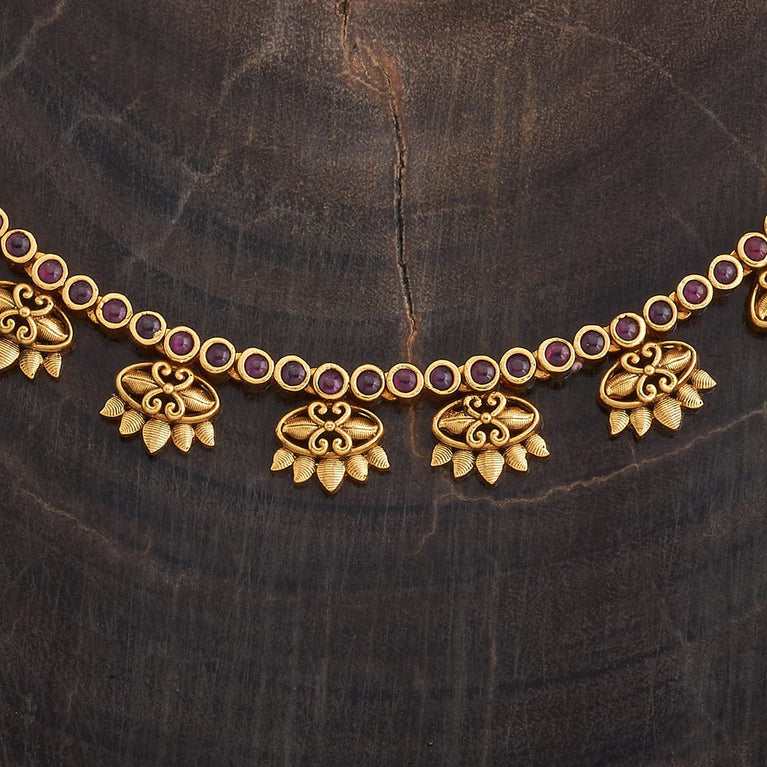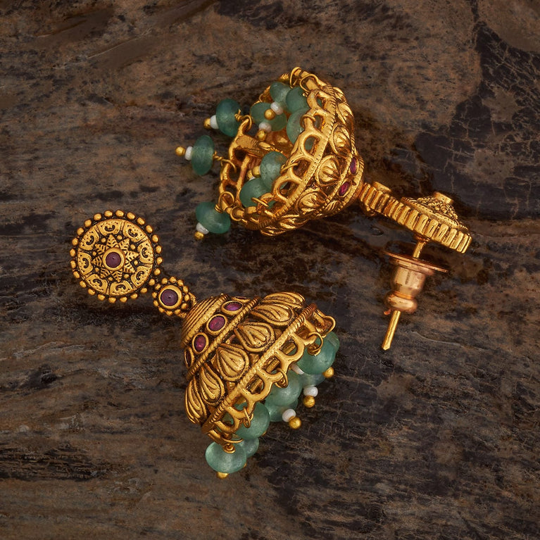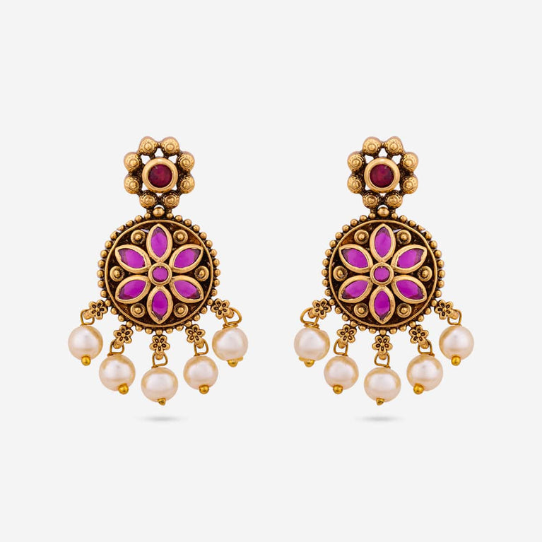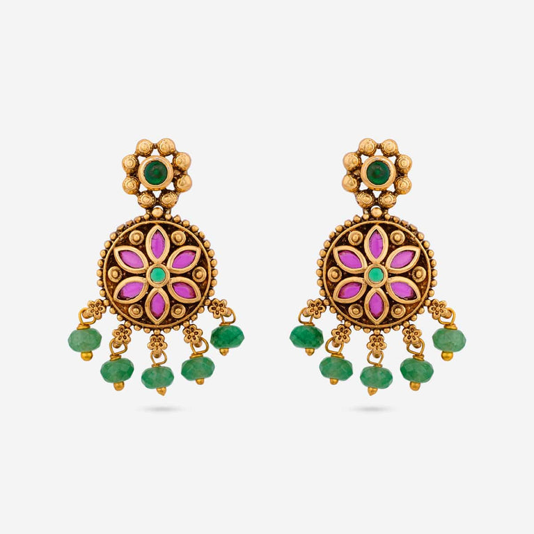 Flower Design Antique EarringMake your outfits look better than ever with these earrings. The antique earrings are designed with ruby-coloured stones set against a gold-tone polish, creating a timeless appeal. The detailing complements the vivid hues of the stones, making them ideal for festive occasions or traditional attire. Pair these earrings with your festive kurtas for a sweet, feminine look.