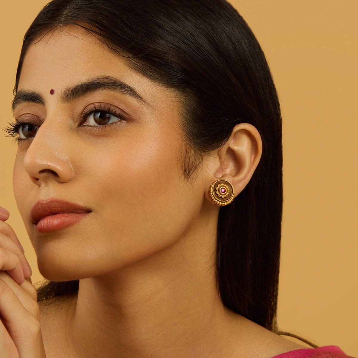 Flower Design Antique EarringMake your outfits look better than ever with these earrings. The antique earrings are designed with ruby-coloured stones set against a gold-tone polish, creating a timeless appeal. The detailing complements the vivid hues of the stones, making them ideal for festive occasions or traditional attire. Pair these earrings with your festive kurtas for a sweet, feminine look.