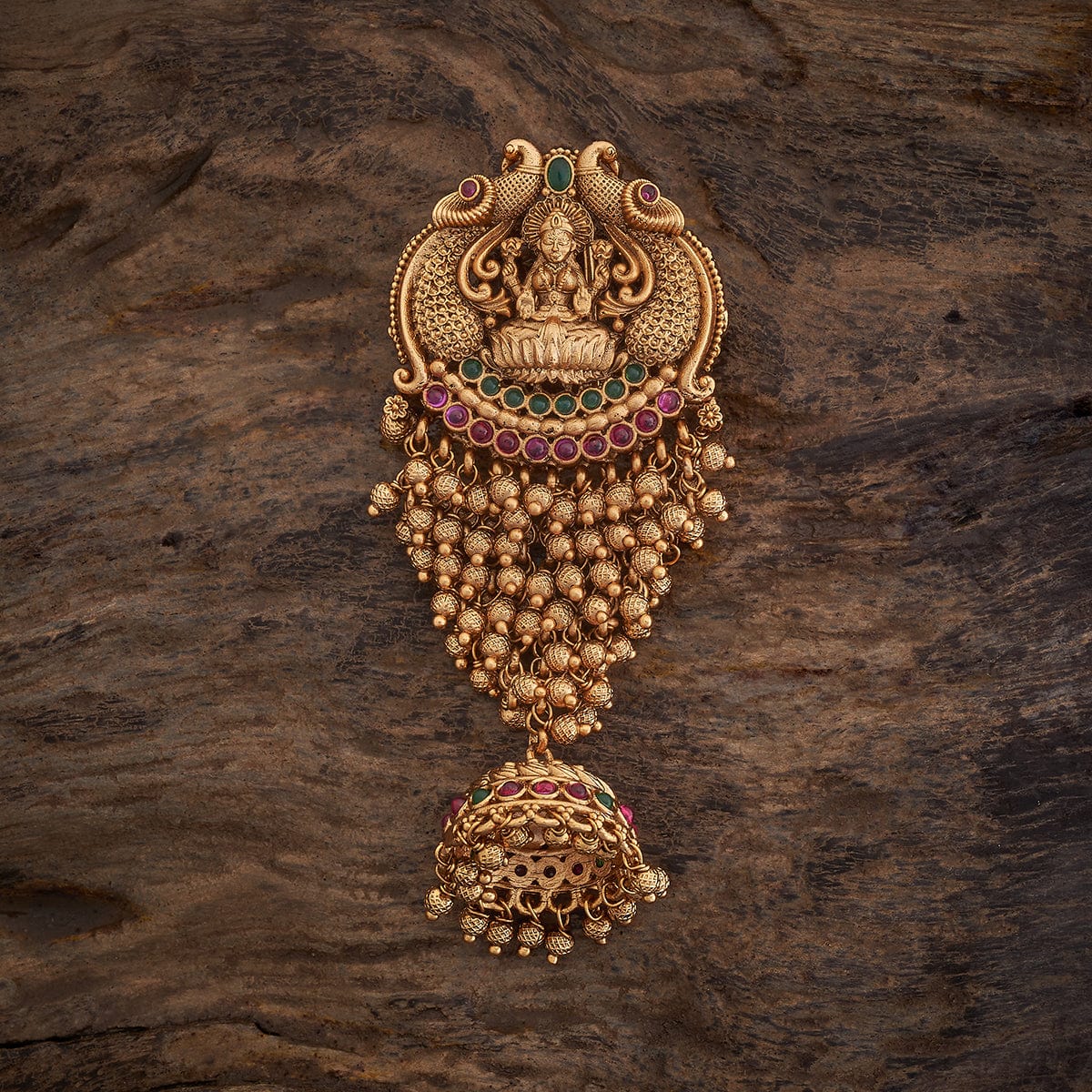 Add a touch of elegance to your hairstyle with this antique hair brooch. Its intricate design, featuring ruby and green stones with a gold polish, gives it a classic Indian touch. The Goddess Lakshmi motif adorned at the top makes it a perfect accessory for festive looks. Wear it with a heavy saree or lehenga to complete your look.