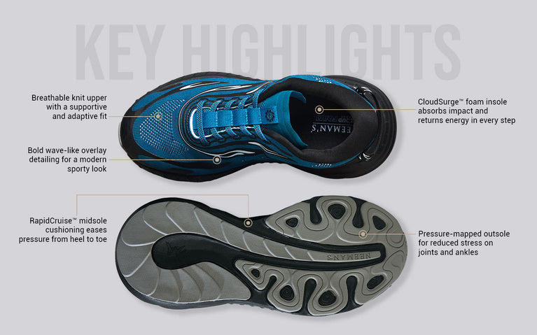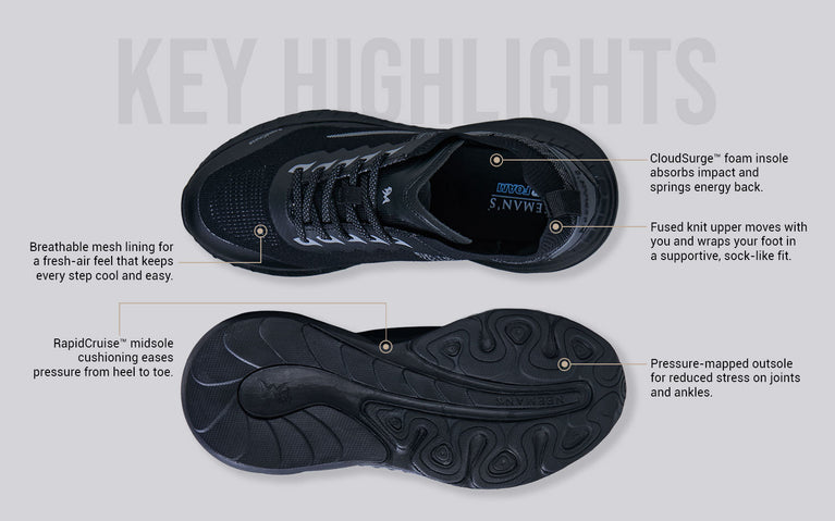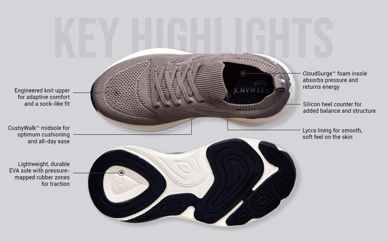 With the dual tech cushioning of our CushyWalk™ midsole and CloudSurge™ foam insole, Begin Walk Ease absorbs pressure and returns energy, adding a bounce to your steps to take on the day’s hustle. Its adaptive performance knit design hugs your feet snugly while keeping them breezy & cool and a pressure-mapped outsole reduces stress on your joints & ankles. This is minimal, with all heart.