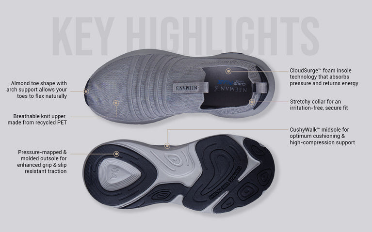 With the dual tech cushioning of our CushyWalk™ midsole and CloudSurge™ foam insole, Begin Walk Ease absorbs pressure and returns energy, adding a bounce to your steps to take on the day’s hustle. Its adaptive performance knit design hugs your feet snugly while keeping them breezy & cool and a pressure-mapped outsole reduces stress on your joints & ankles. This is minimal, with all heart.