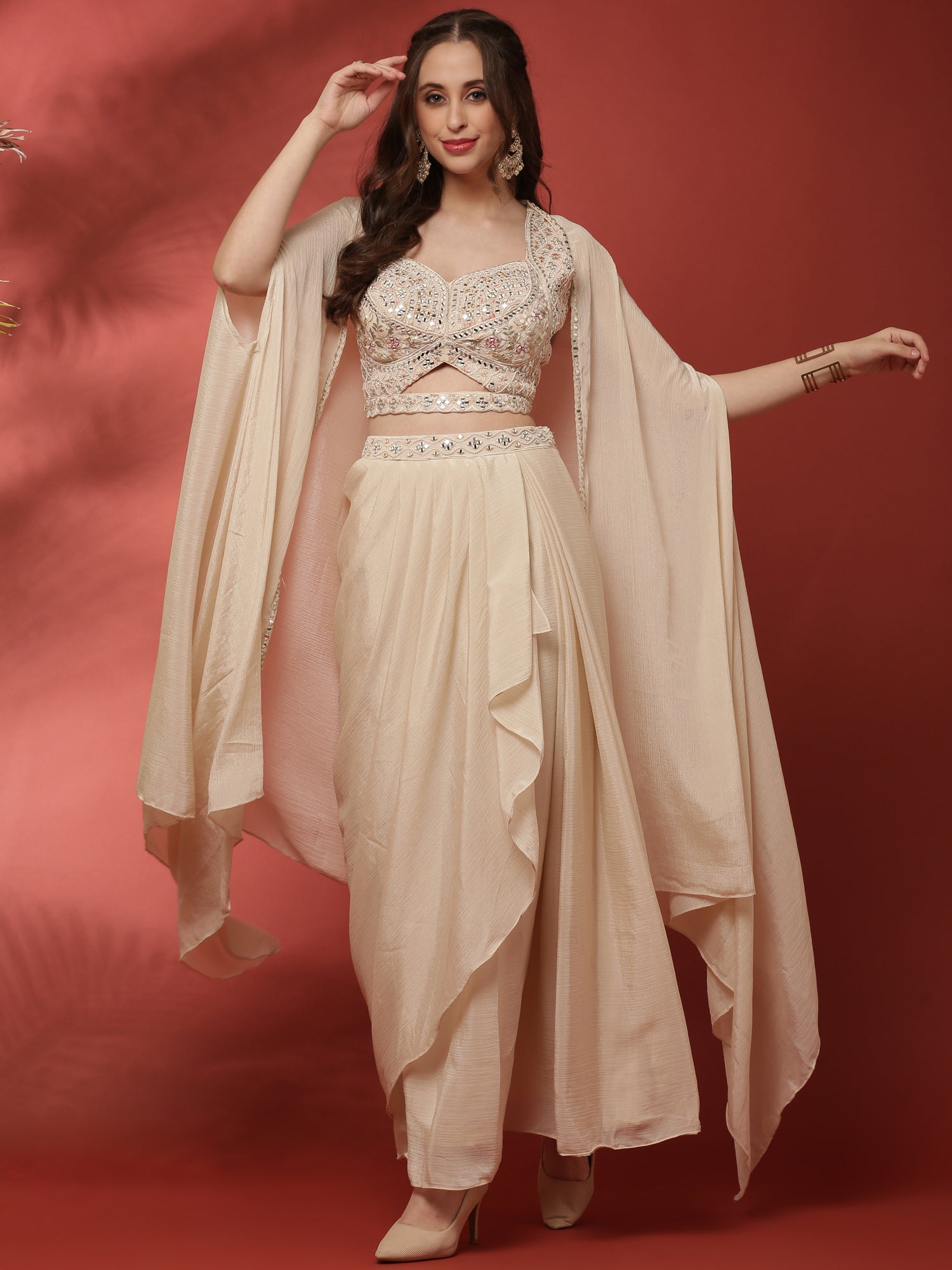Step into elegance with the Cream Handwork Blouse Skirt Set featuring a coordinating jacket. Beautifully crafted with intricate hand embroidery, this set highlights delicate artistry and refined style. The soft cream shade offers timeless appeal, while the matching jacket adds a layer of sophistication and versatility.