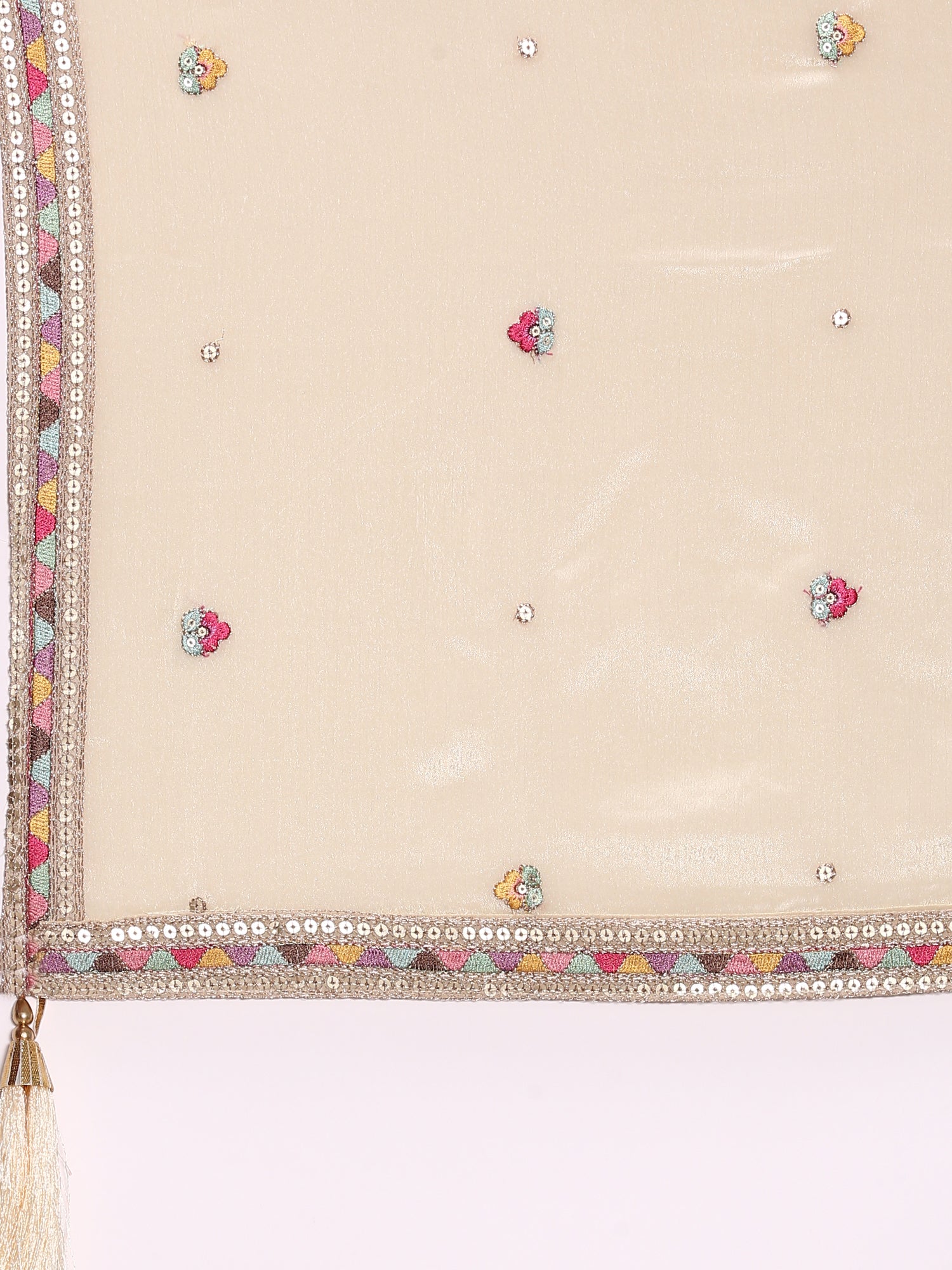 Elevate your ethnic wardrobe with this stunning cream tissue Anarkali set, beautifully adorned with delicate floral embroidery. The lightweight fabric drapes gracefully, offering comfort for both festive occasions and celebrations. The intricate embroidered details add a touch of sophistication and timeless elegance to your look. Perfect for weddings, parties, or cultural events, this set combines traditional craftsmanship with contemporary style. The cream tone complements all skin tones, making it a versatile choice for any complexion. Embrace the charm of classic Indian fashion with this exquisite piece that celebrates artistry and grace.