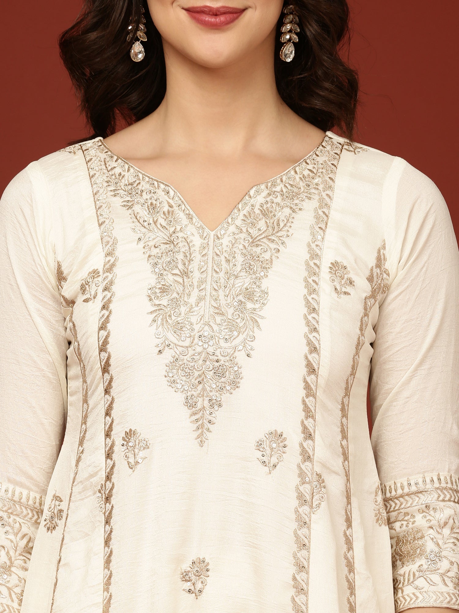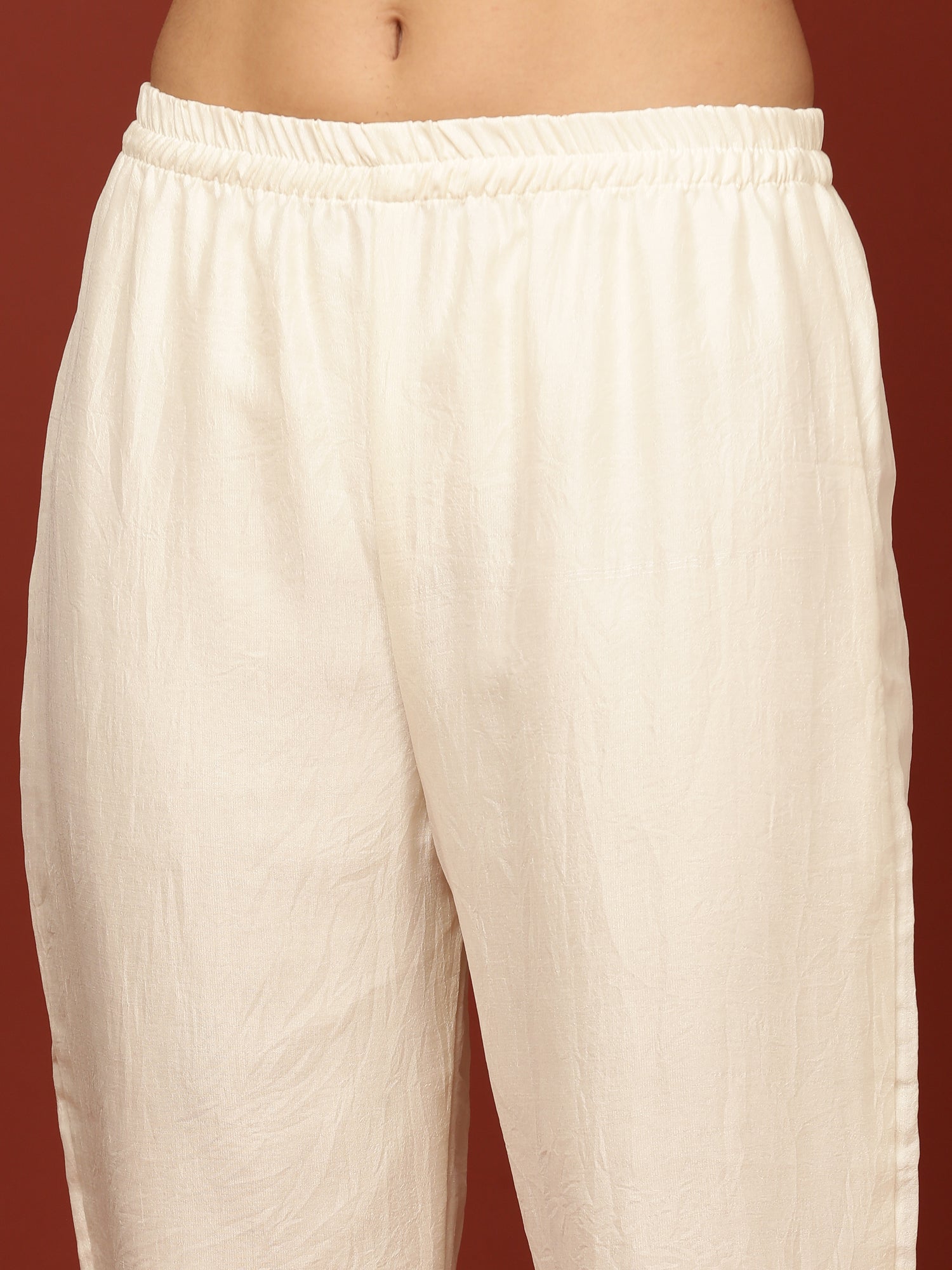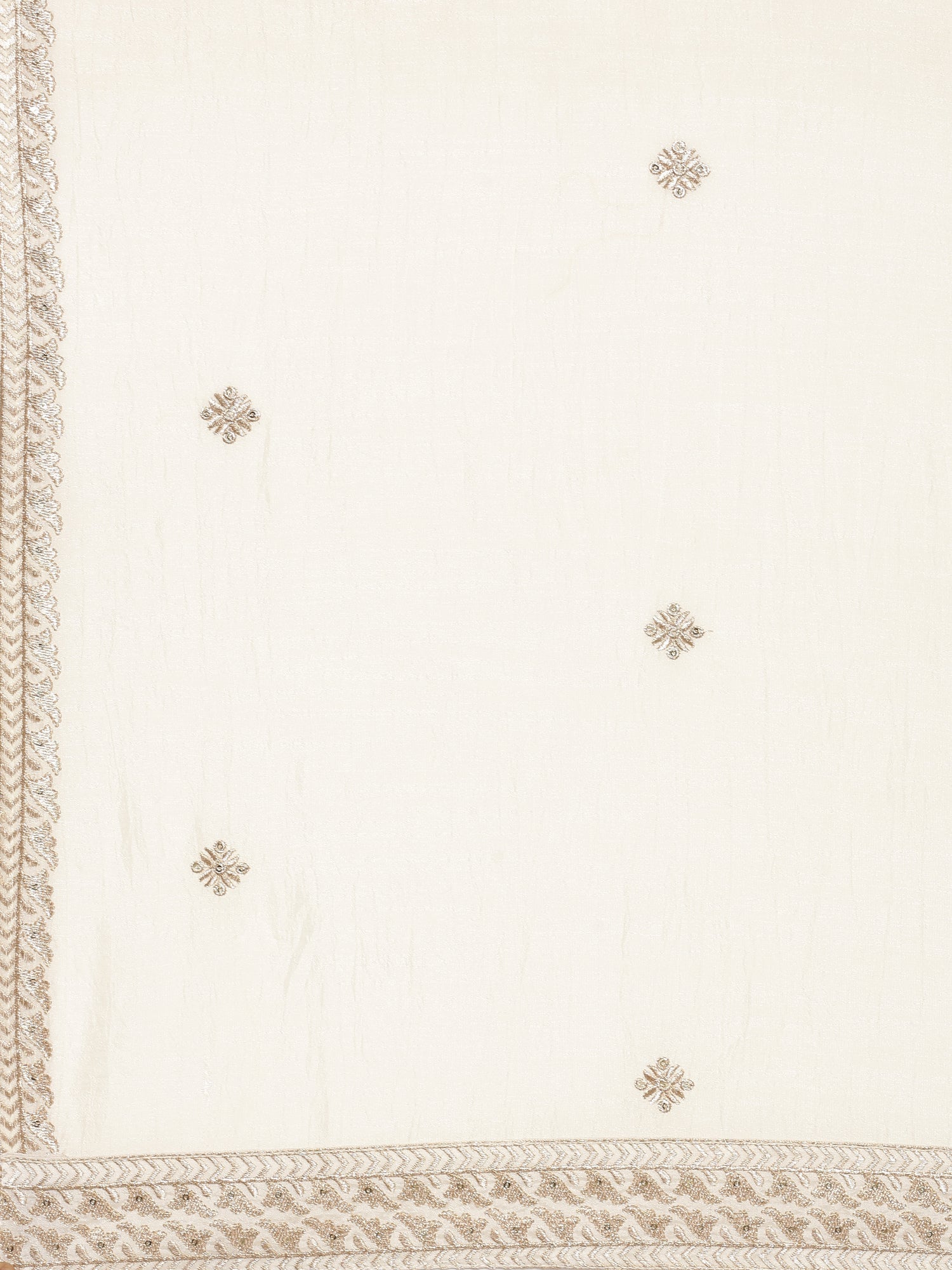 The Cream Vichitra Silk Three Piece Set combines luxurious texture with refined design. Made from high-quality Vichitra silk, this set includes a saree, blouse, and dupatta that offer a soft, lustrous finish. Its natural sheen and lightweight drape make it perfect for formal events, ensuring both comfort and elegance. Meticulously crafted, this ensemble enhances your traditional wardrobe with understated sophistication and expert tailoring.
