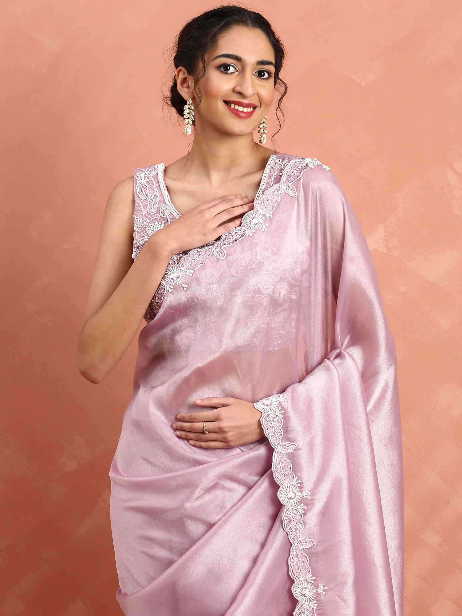 Lilac Jimmy satin tissue saree with pearls & sequin embroidery with ready made blouse